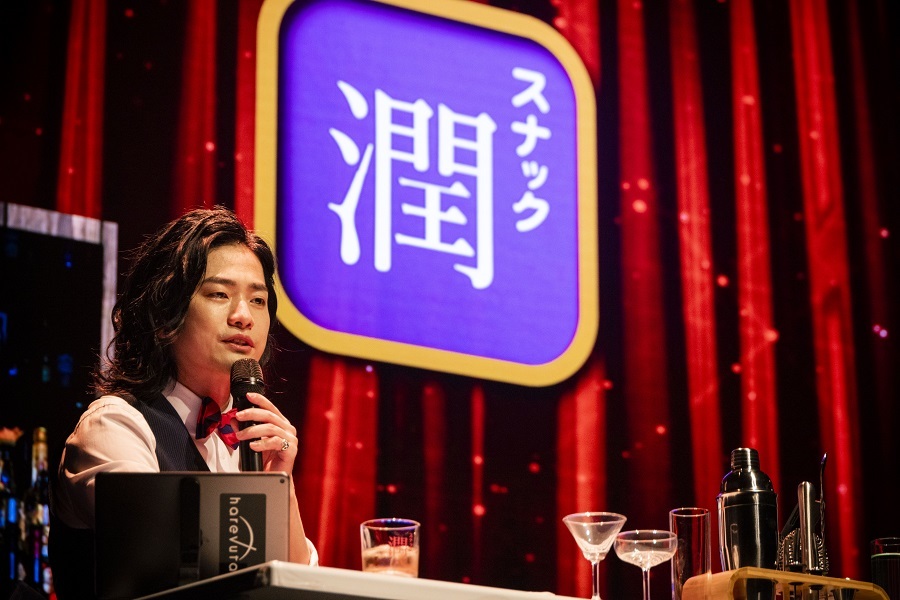 バーテンダー衣装に身を包んだ福山は、ステージ上に用意されたバーカウンターに座り、3年ぶりに「スナック潤」がOPEN。お店の厳しい経営事情にひとしきり愚痴をこぼしたあと、「俺たちの素敵な夜に、ボッチの夜に、乾杯!」と音頭を取ってイベントスタート。
