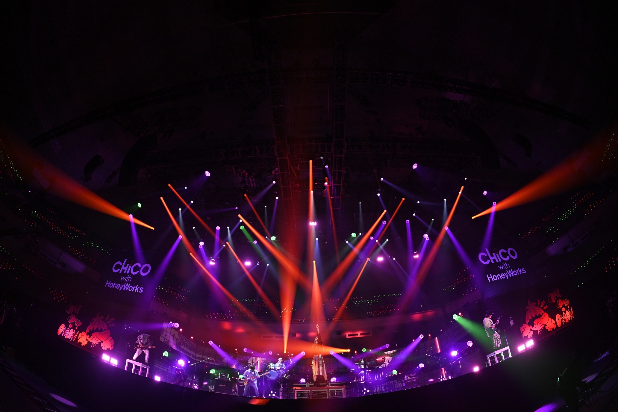 まずはOji(g)、中西(g)、宇都圭輝(key)、Hiroki169(b)、AtsuyuK!(ds)がインストゥルメンタルで期待感を高めてくれた上で、ステージ後方に現れたCHiCO。手を高く上げて力強く歌い始めたのは、「今日もサクラ舞う暁に」だ。1階から3階まで360度すべての客席にペンライトを思わせるライトが瞬く中、オーディエンスのコールが聴こえなくても、タオル回しが見えなくても、メンバーの熱量は変わらない。