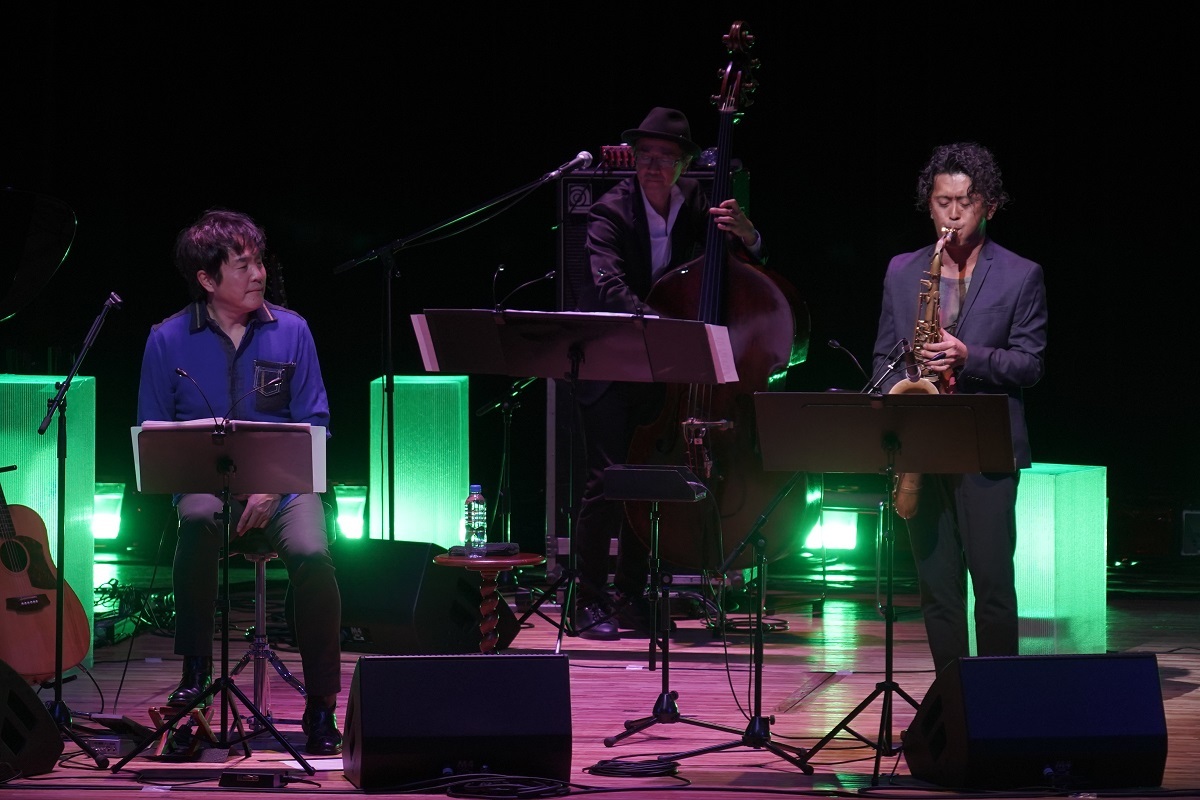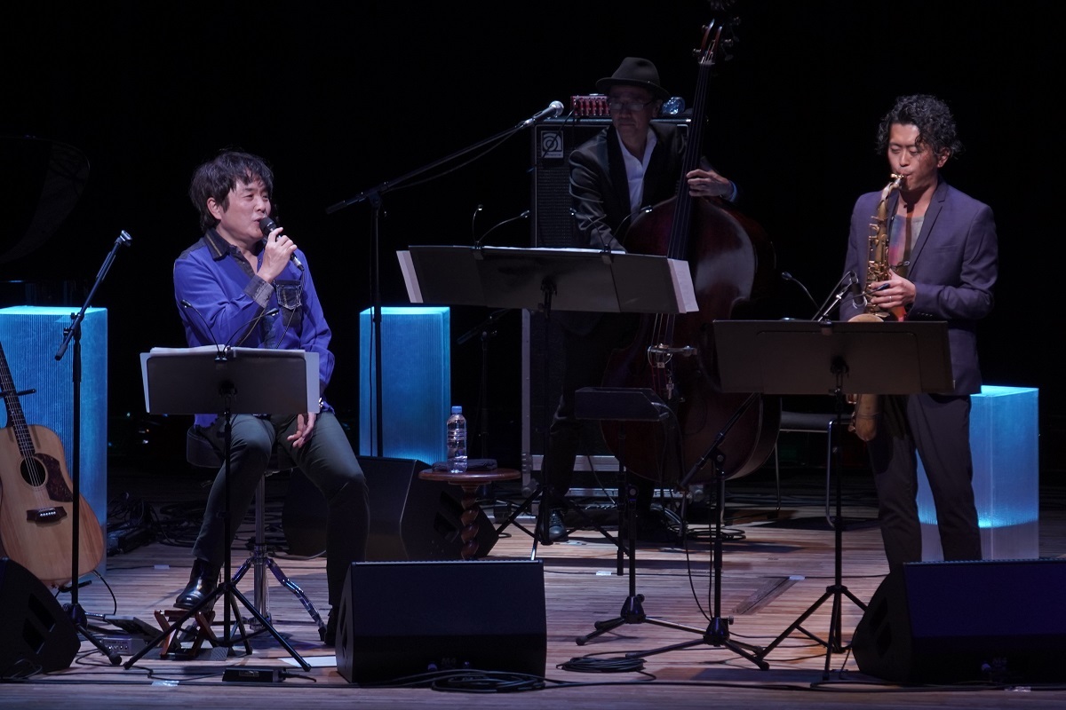 例えば、2011年から山下達郎のツアーにも参加しているサックス奏者、宮里陽太がゲストで登場。竹善は、山下達郎の声帯模写も交えながら「ルックスからしてフェロモン!な感じでしょ」と彼を紹介したが、もちろんルックス以上に演奏はロマンチックだった。さらには、今年11月に7年ぶりのリーダーアルバム『Wonderful World』をリリースした宮本が、そのアルバムにも収めたスタンダードナンバー「Tea For Two」をJazz Creaturesの演奏で披露。シックなボーカルを聴かせた。
