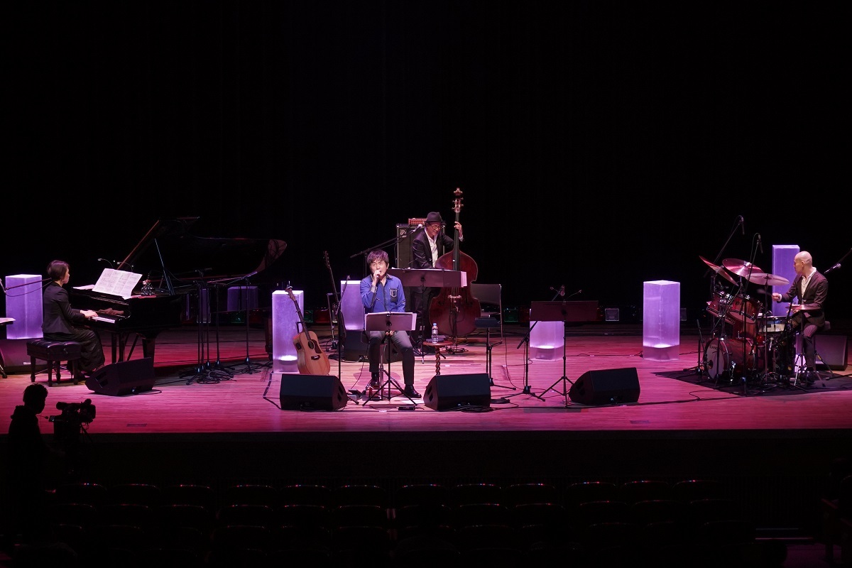 江藤良人(Dr)の溌剌としたカウントから演奏が始まり、宮本貴奈(Pf)がサウンドの輪郭を定め、井上陽介(Ba)がグルーヴに表情をつけていったところに、佐藤竹善がヒョイという感じで《Walkin’》と乗っかってくる。オープニングは、このメンバーで最初に録音した曲「Winter Wonderland」だ。今や子供でも知っているポピュラーなクリスマスソングが随分とソフィスティケイトされた感じで展開していき、コーダではバックの3人が《Walkin’》と繰り返すコーラスに乗って竹善がフェイクを効かせてシャウトする。どこを歩いて行くのかと言えば、それはもちろん真冬の不思議な世界=Winter Wonderlandだ。ジャズフレイバー香る端正な演奏と情感豊かなボーカルに導かれて、僕たちもその真冬の不思議な世界に入り込んでいく。憂鬱な鳥は去り、新しい鳥がラブソングを歌うという歌詞の意味がわからなくても、それを歌う竹善の歌声に溢れている喜びの感覚が“これから楽しいことが始まるぞ”と思わせてくれる。
