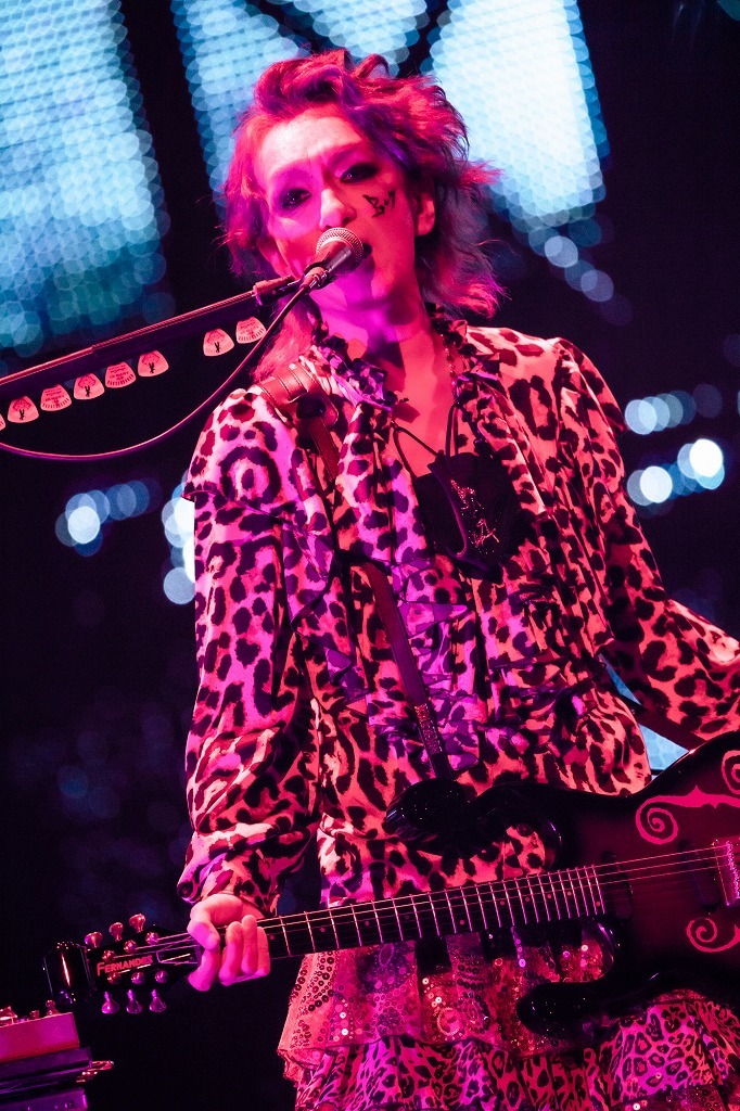 一曲一曲の世界観を演じるように歌う櫻井のパフォーマンスも冴えていた。「URAHARA-JUKU」で真っ赤に光る床に寝転がったまま歌う姿は息を飲む程美しく、星野英彦(G)の爪弾くイントロが冷ややかに響いた「凍える 」で子供を腕に抱いてあやすように揺れる姿は慈愛に満ちていた。直前に赤い口紅を自らひいて歌い始めた「舞夢マイム」では、看板にBUCK-TICKの過去曲のタイトルが散りばめられた飲み屋街の風景をバックに、表情と細かい手の仕草で男女2役を演じ分けた。
