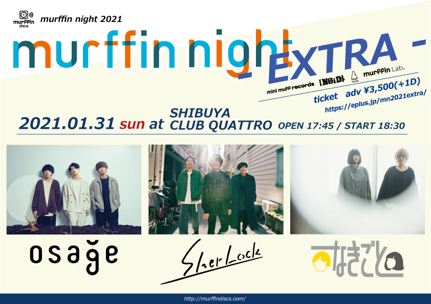 今回は、2021年1月31日に渋谷CLUB QUATTROにて、2018年のmurffin AUDITIONグランプリアーティスト「osage」、準グランプリアーティスト「なきごと」そして、2019年murffin AUDITIONグランプリアーティストの「SherLock」の3バンドでの開催となる。