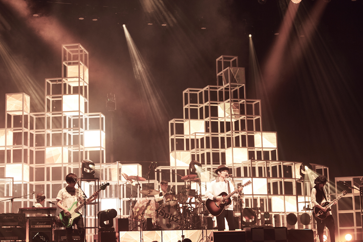 コンサートは、おそらく(いや、彼らのことだから間違いなく)マスク着用で着席限定の観客を意識したのだろう、座っていても楽しめるような、ゆったりとしたグルーヴの楽曲で幕を開ける。1曲目は「恋のはじまり」。ステージ後ろには、ジャングルジムを大きくしたような、アート作品のような、立方体のオブジェがでんと構える。サポートのクジヒロコ(Key)も含め、メンバー全員がモノトーンのシックな装いで、草野マサムネ(Vo/Gt)は黒いハットで決めている。
