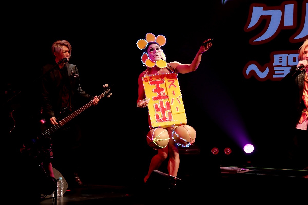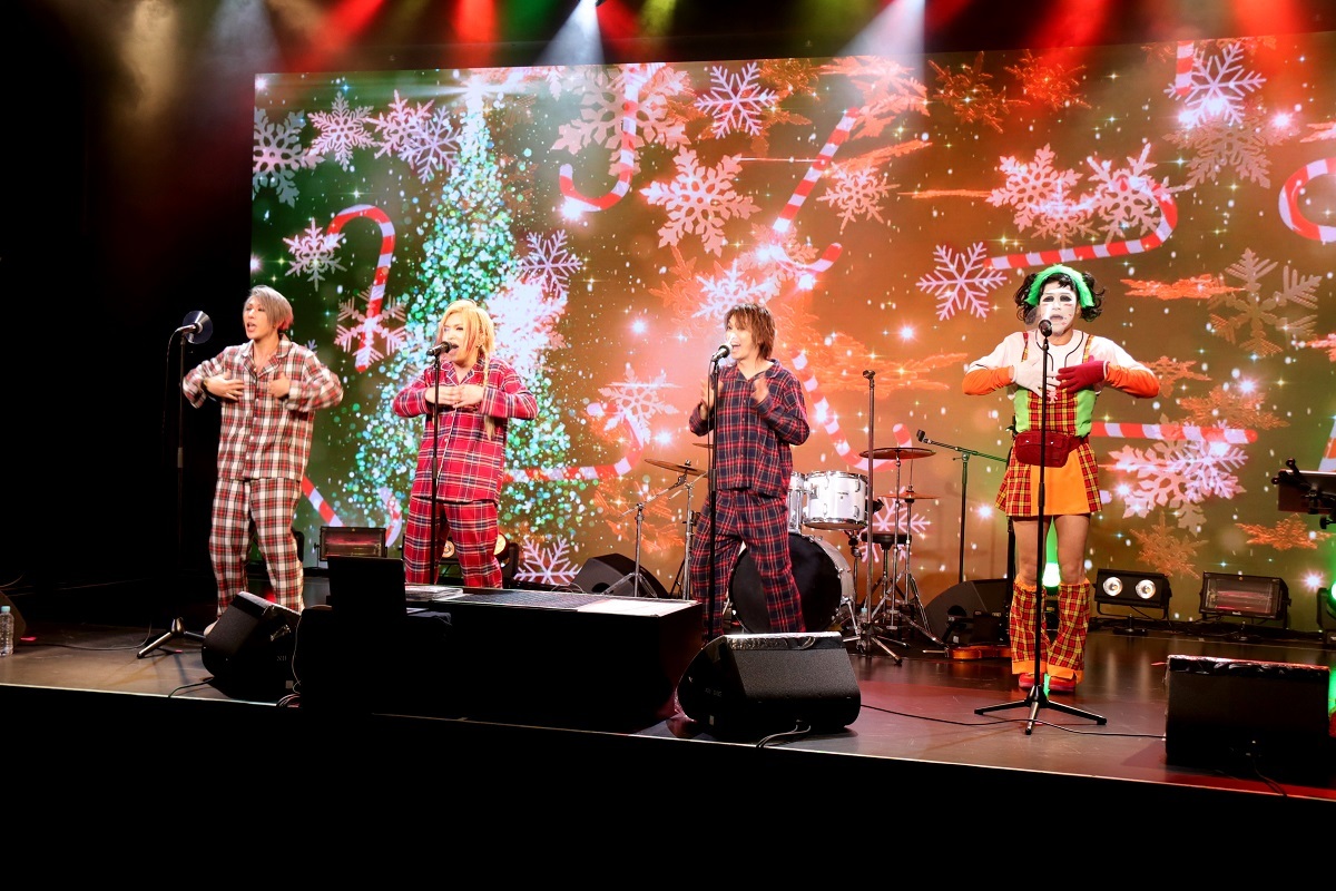 メリークリスマス! 合わせた4つのグラスが聖なる音を響かせる。鬼龍院翔(Vo)のワイフが腕を振るった料理に舌鼓を打つメンバー。ゆらめく暖炉の炎。年末年始の予定を笑顔で語り合う光景は幸せそのもので。『ゴールデンボンバークリスマスライブ~聖夜の夢漢却廃神~』は、こんなふうに安らかに幕を開けた。しかし安らかなまま閉じるわけないのがゴールデンボンバー。異常気象で森に木の実がなかったのかな、いや、毛の色的には北極からわざわざ!? 突如現れたしろくまが窓ガラスを突き破り、襲いかかる。瞬く間に広がる地獄絵図。鬼龍院が最後の力を振り絞って書いたダイイングメッセージは「ゴールデンボンバーワンマンライブはじまるよ」。映像がライブ会場に切り替わり、血みどろメンバーの放つオープニングナンバーが「デスメンタル」なんて、出来過ぎです!