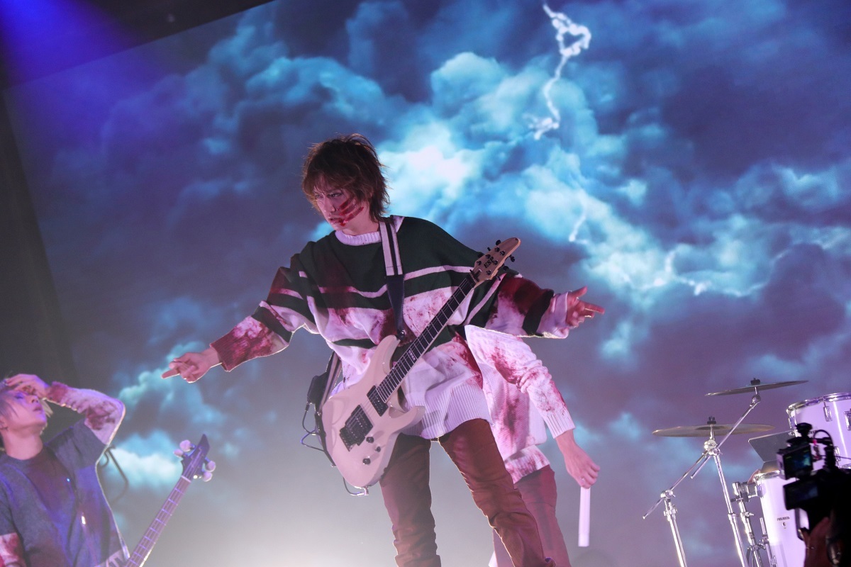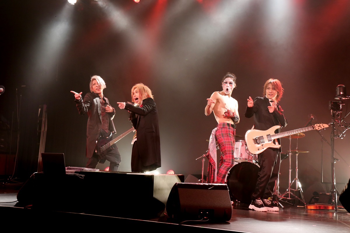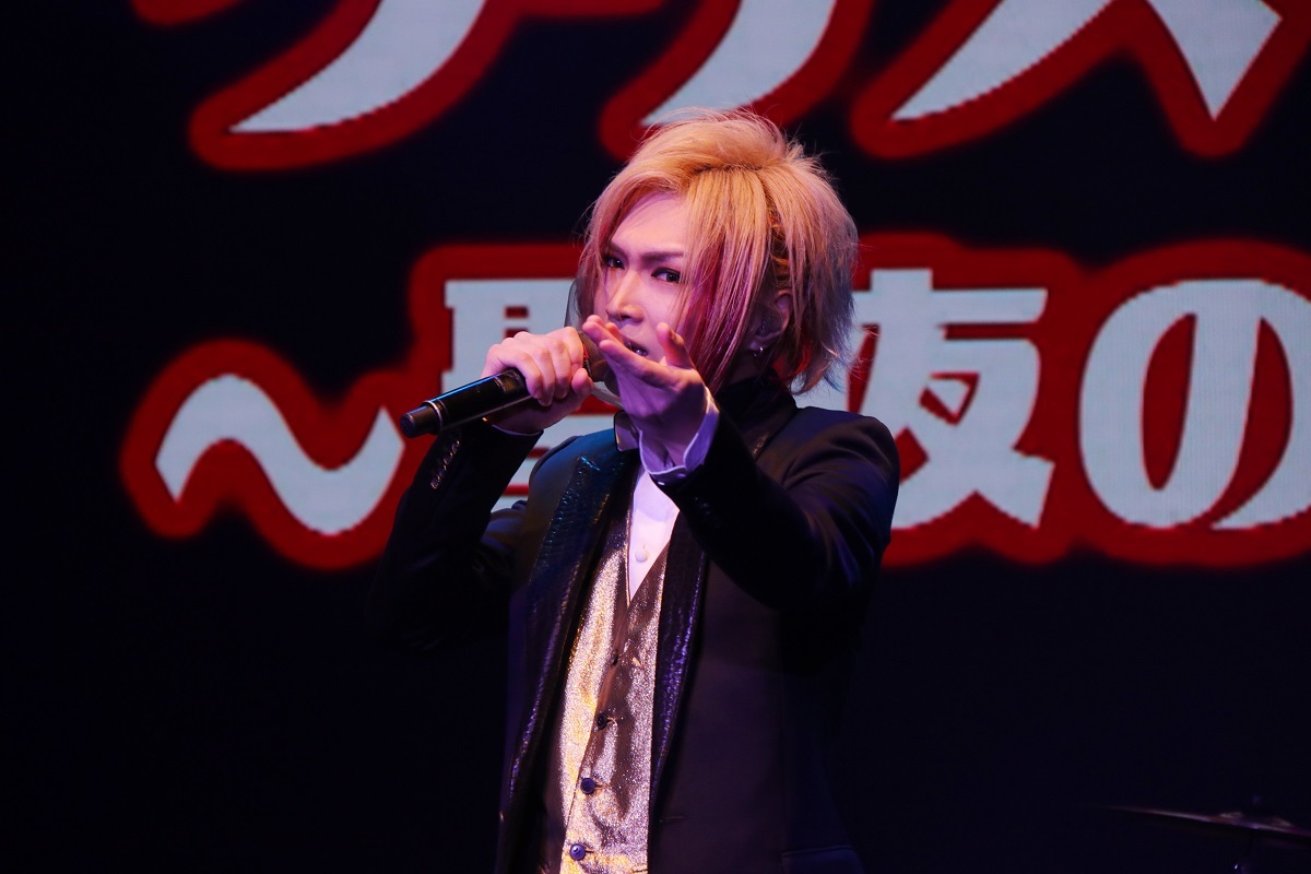 「今夜は?」と呼びかけると、「トゥナイト」の文字が画面の上をものすごい勢いで横切る。《電車よ終わるな》、一秒でも長く一緒にいたい恋心を切実に歌い上げると、その想いを乗せたギターソロで喜矢武、無限列車姿に。そしてスロープを使ってフロアへ降りた瞬間、映像は雪山に切り替わり、山肌を猛スピードで駆け抜ける。麓で慌てふためくメンバー&スタッフと、満面の笑みを浮かべる喜矢武のコントラストがちょっぴり怖い。鬼龍院がスライディング、必死に掴んで列車を止めるというエンディングはもうめっちゃ怖い。のちのMCで、止まった少し先は崖だったことが明かされ「壮絶過ぎたから、YouTubeにのっけようと思う」との予告通り、ただいま絶賛公開中ですので、各自ご確認を。