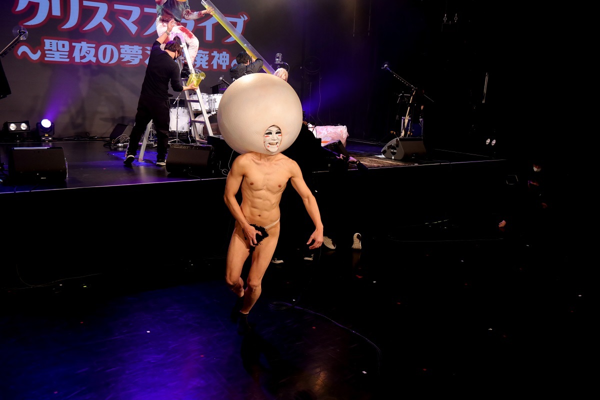 MCが始まると、鬼龍院は自らが残したダイイングメッセージによって不思議な力が湧いて、ライブができているという設定を説明。補足するように、歌広場淳(Ba)がコメント欄の盛り上げ方を伝授する。一方、喜矢武豊(Gt)は流行りのソロキャンプにチャレンジしたいと言い、樽美酒研二(Dr)は、雪だるまのオリジナルマスコットを考案したと話す。そのまま「抱きしめてシュヴァルツ」に突入したということは? ハイ、ギターソロで何か起こりまーす。雪だるまのキャラクターに変身した樽美酒は、早々と体部分の風船を割られて、頭は白いまんまる、首から下は全裸に見えるTバック姿に(笑)。片や喜矢武は赤い服を着たくまの衣装に着替え、はちみつの壺を抱え、さらなるはちみつを要求し、恐らく史上初の流しはちみつに挑戦。粘度の高いはちみつを直接口で受け止めた喜矢武は悶絶。歌広場が噛みしめるように「命を賭けたギターソロ」と呟けば、鬼龍院は「喜矢武さんはリスクのあるものが好きだからなぁ」と答える。かと思えば、近況を聞かれた喜矢武が大ヒット上映中の『鬼滅の刃』を絶賛し、「劇場版『無限列車編』の実写化、必ず私が実現させます。役者・喜矢武豊、応援よろしくお願いいたします」なんて力強く宣言。「何役なんだろう?」と首を傾げるメンバー。この一連のやりとりが数分後に巻き起こる事件の前振りだったとは、まだ知る由もなかった。