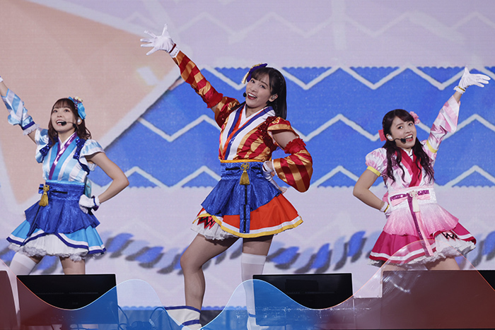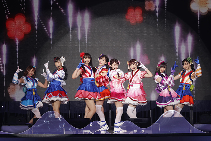 そうしているうちにいつもの学校のチャイムに変わって除夜の鐘で告知タイムへ。3月31日発売のアニメPV付き5周年シングル「smile smile ship start」のフルCGアニメによるPV公開や現在沼津で開催中の5周年記念展、そして5月1~2日に静岡県・つま恋リゾートにて初の野外ライブの開催決定のお知らせがあり、メンバーも野外ならではのことをやってみたいと期待のコメントを寄せた。