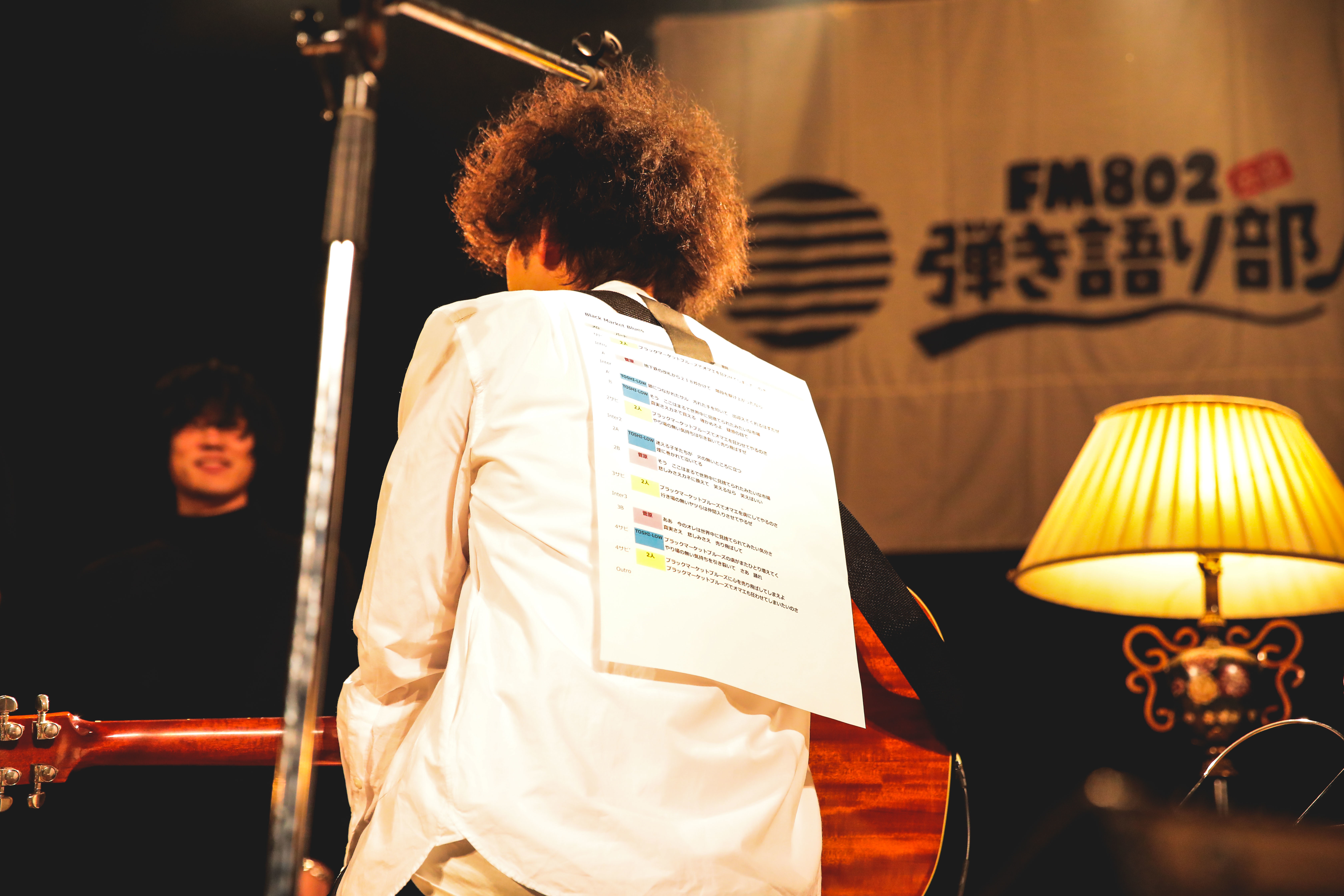 ライブを終えたばかりの松本の元へ樋口が合流し、「ここからはもう大波乱です、ヒヤヒヤしています(笑)」とバトンをつないだのは、二番手の9mm Parabellum Bulletの菅原卓郎。真紅の照明に照らされゆっくりとギターをかき鳴らせば、自ずとクラップが沸き立つ1曲目は「ハートに火をつけて」。文句のつけようがない余裕と貫禄の漂うパフォーマンスで、ステージ上のランプに灯った光が頬を照らした「The World」でも、アーティストの部屋をのぞき見しているようなFM802弾き語り部ならではのアットホームさと、ギター1本でもビンビン伝わってくるすごみと経験値に酔いしれる。ただ、樋口の懸念通り、そうは問屋が卸さなかった!?(笑)