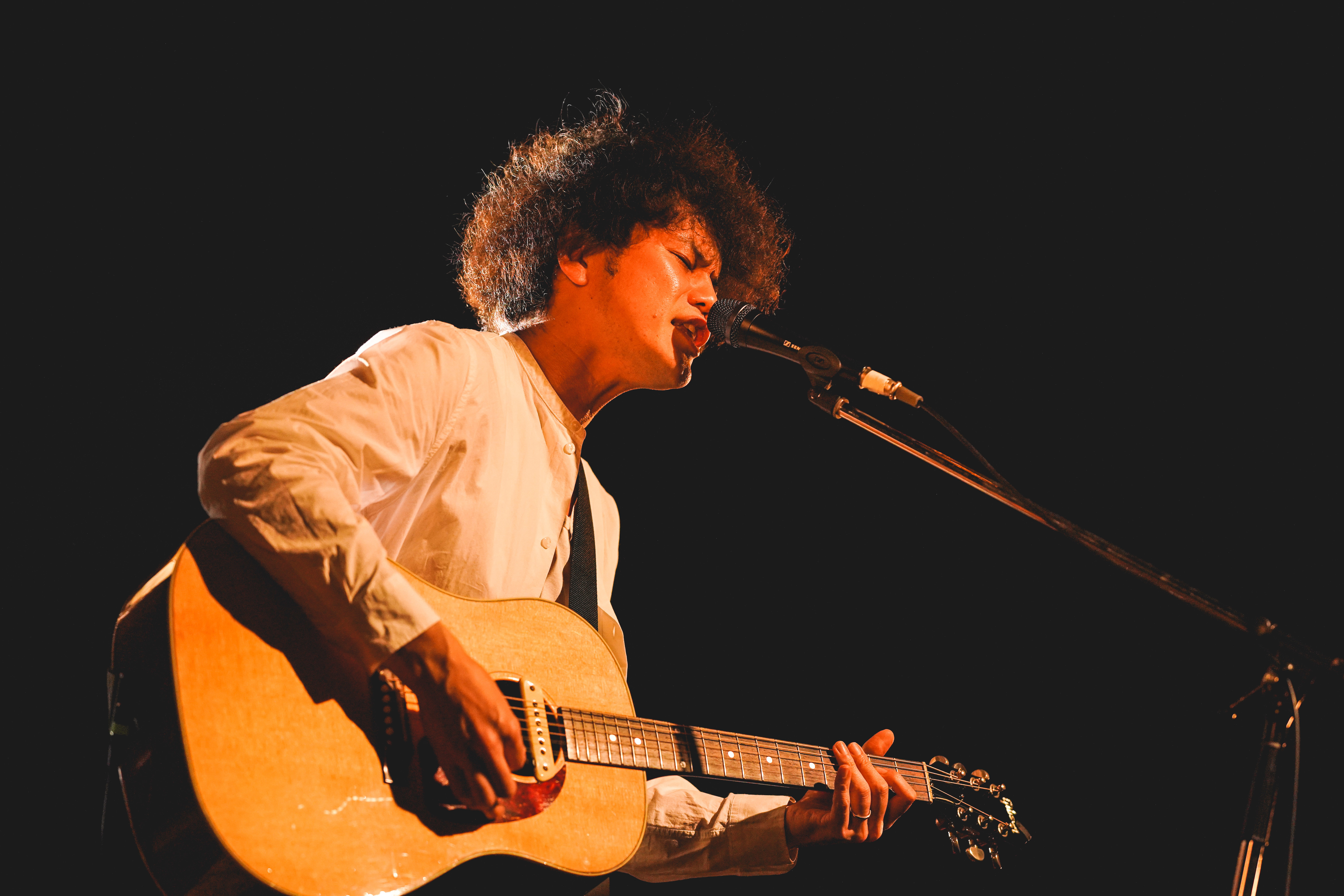 舞台へと現れた司会のFM802DJ樋口大喜も、観客からの大きな拍手に迎えられ心底うれしそうな表情で、続いてFM802弾き語り部・部長の松本がステージへ。「今日は笑い多めで」という先輩方からの地獄のミッションを授かった松本だったが、「今日は年功序列です(笑)、よろしくお願いします」とリラックスした表情で歌い出すや、一気に楽曲の世界に引きずり込まれる。コロナ禍に制作された最新アルバム『FRAGILE』で大躍進を遂げたLAMP IN TERRENは、つい2日前に同会場でリリースツアーの大阪ワンマンを行っており、そこでは4人の力強いバンドサウンドで鳴らされた「ワーカホリック」が、その吐息までもが表現であるかのような優しい静寂の中に沁み渡っていく。