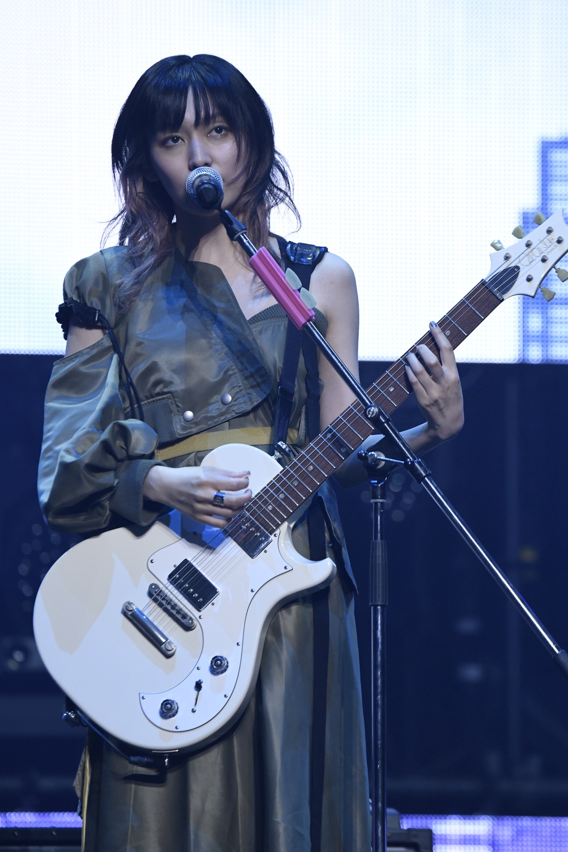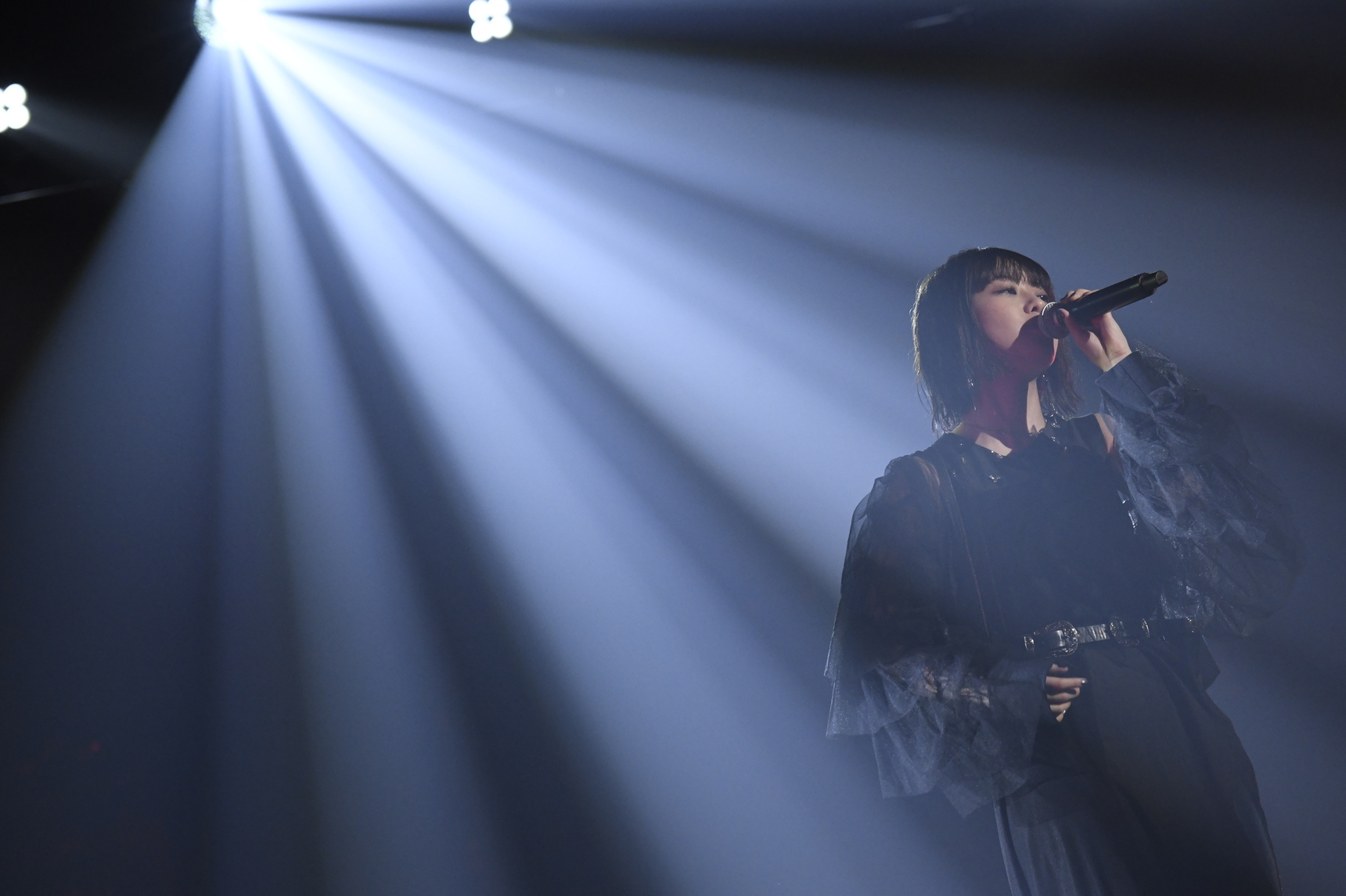 続く2曲目の冒頭では、「ごきげんよう、Cö shu Nieです」と、ささやくように自己紹介。TVシリーズ『PSYCHO-PASS サイコパス3』エンディングテーマの「bullet」を歌った。ウィスパーボイスや、特にサビで奏でられる、美しくも棘があるような力強い歌声。単に「変幻自在」という言葉では言い表せない、いろいろな表情がありながら、すべて同じ女性の歌声と納得できる、個性の際立った音楽が奏でられる。ずっと耳に残るような、中毒性の高い舞台だ。
