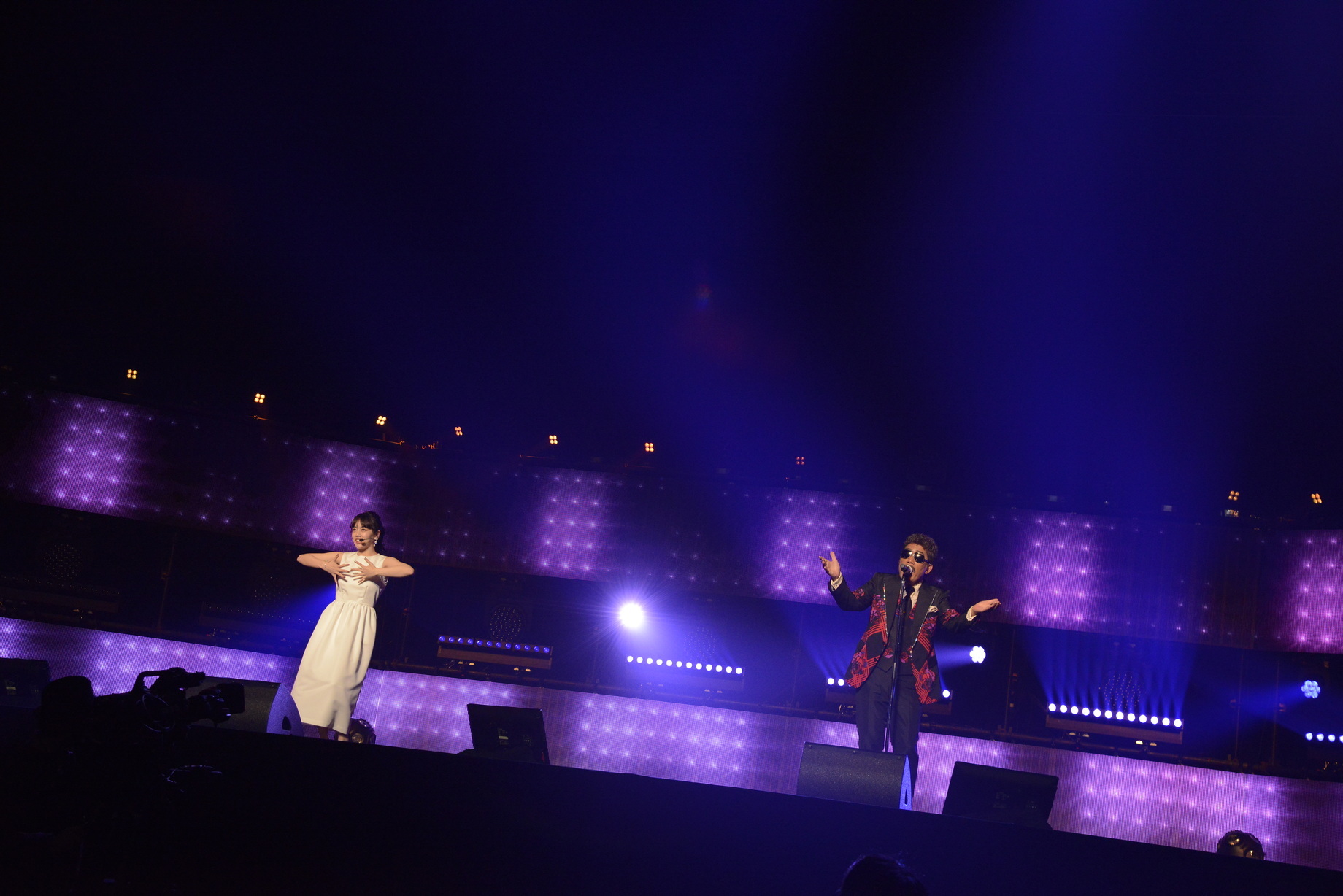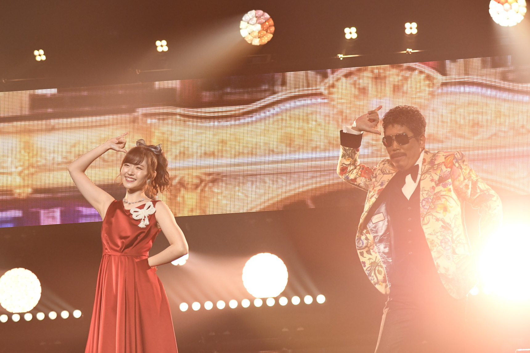 2曲目には、同アニメシリーズから「DADDY!DADDY!DO! feat.鈴木愛理」を披露。鈴木愛理は真っ赤なドレスで登場し、鈴木雅之もまた違った柄のジャケットを羽織って登場。アグレッシブに、ふたりで歌とダンスをキメる。両ステージとも、巨大なシャンデリアが天井に現れ、日本武道館をゴージャスな舞台に作り変えていた。