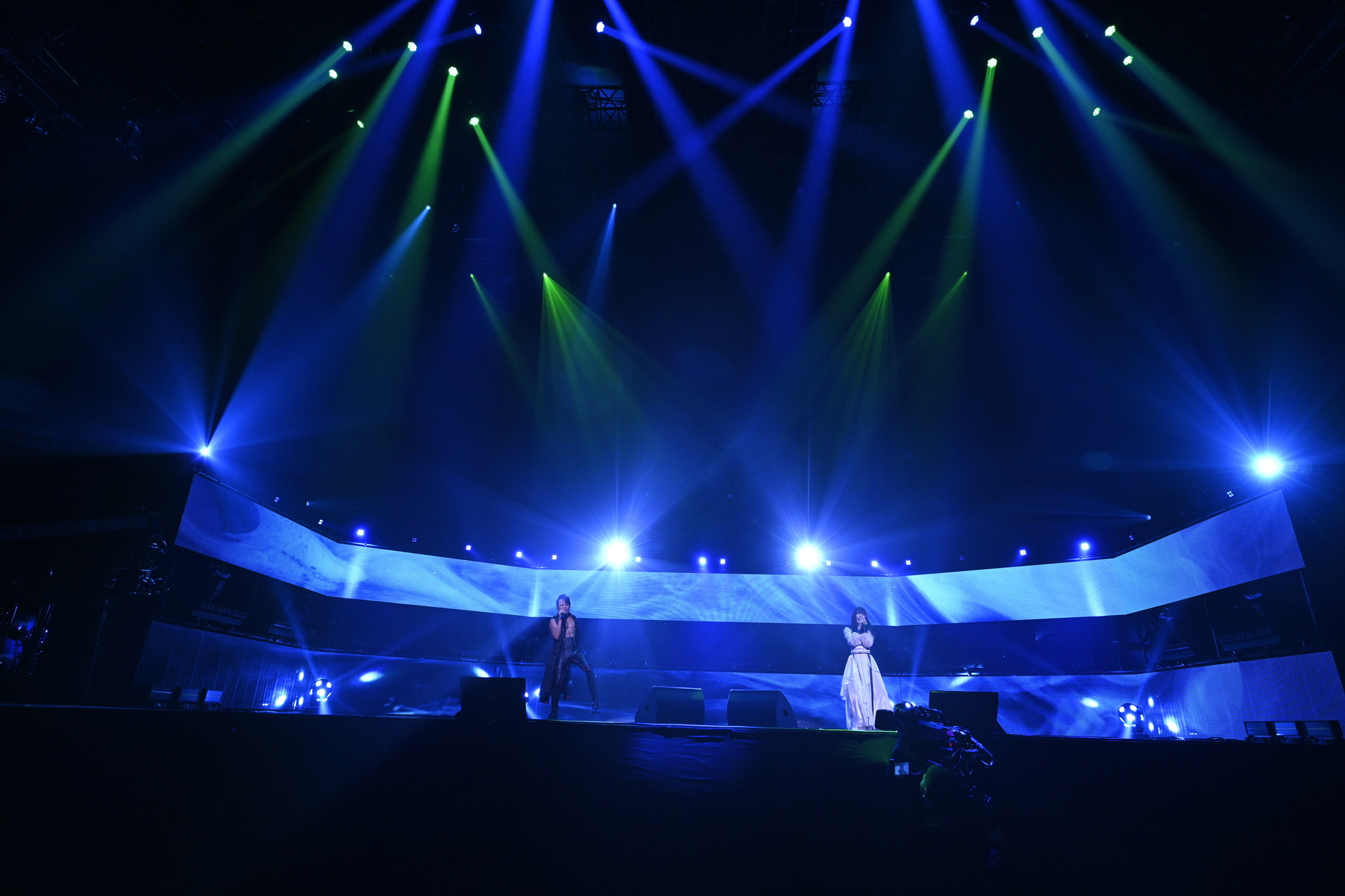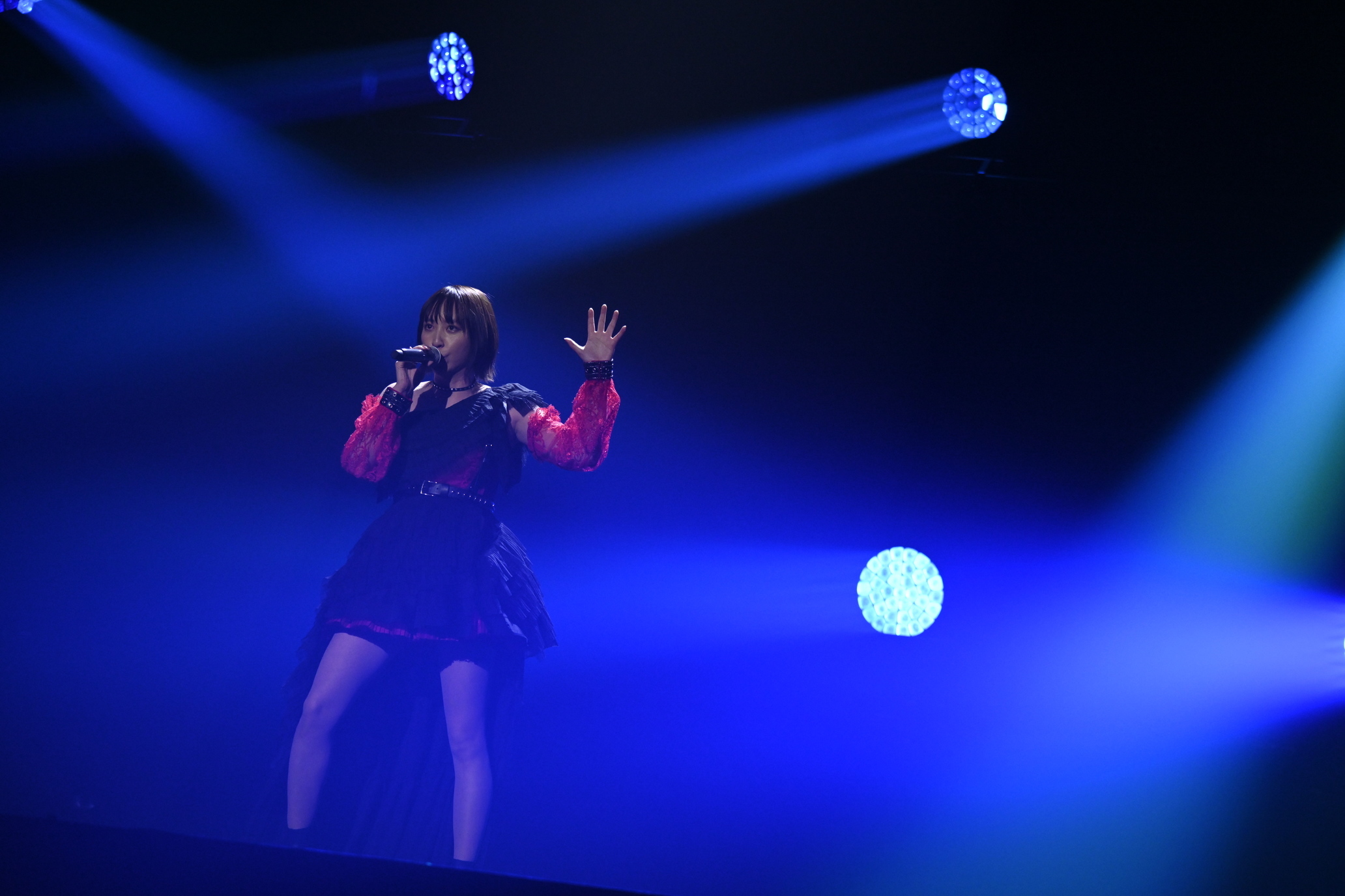 続く2曲目にも、『SAO』シリーズより「I will……」を披露。青のサイリウムで埋め尽くされる中、会場へ向けて、そして全世界へ向けてその情熱的な歌声を放つ。この大舞台の幕開けに相応しいパフォーマンスを披露した。