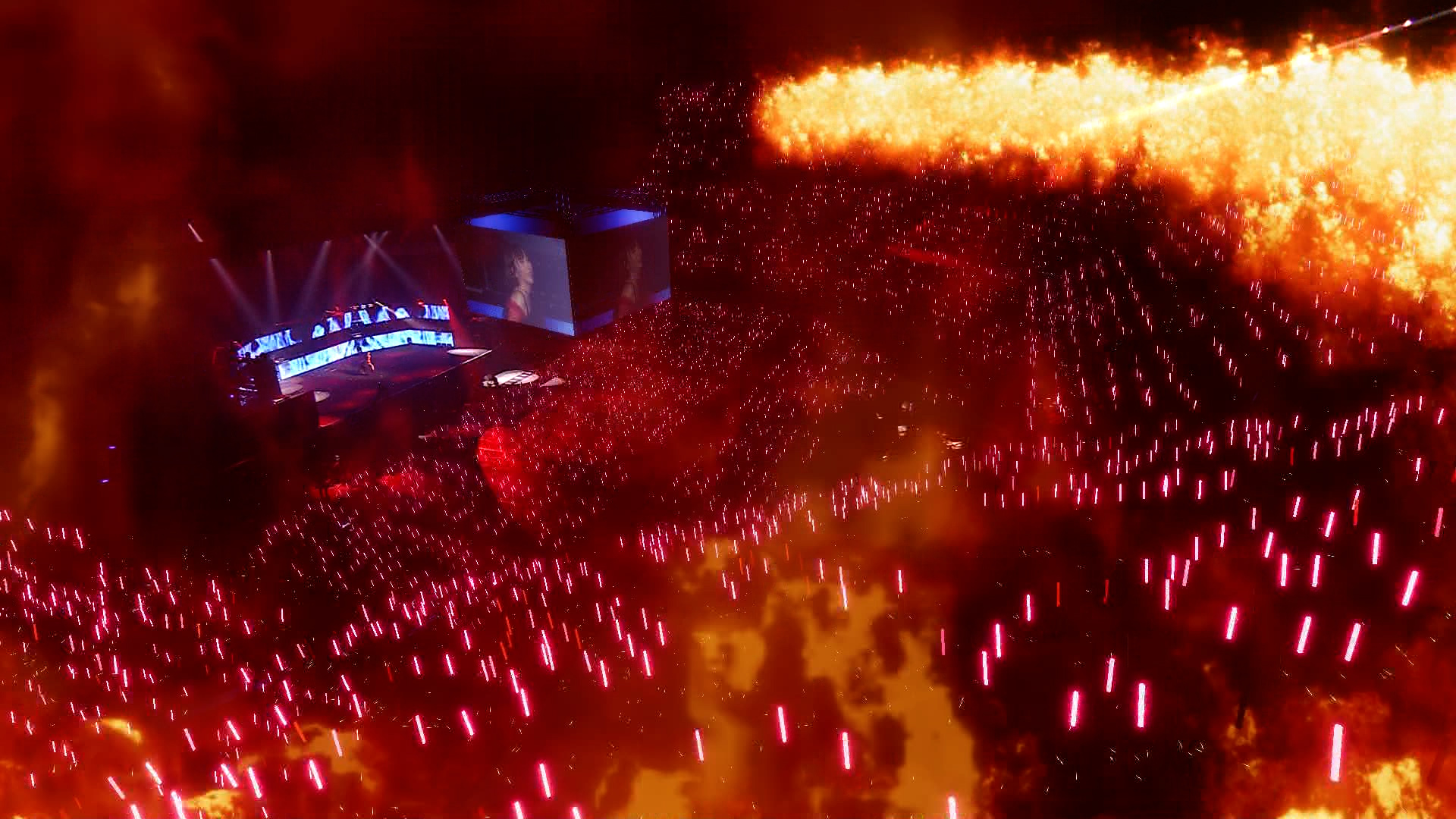 真っ暗なステージの中、一筋のスポットライトに照らされながら、最初に登場したのは藍井エイルだ。1曲目にはTVアニメ『ソードアート・オンライン(SAO)』シリーズから「IGNITE」を披露。冒頭のフレーズ「その手で撃ち放て」に合わせて指で銃の形をつくると、次の瞬間、ステージから客席へと炎がブワッと燃え広がるような演出が起こり、炎の中から会場を埋め尽くすサイリウムが現れる。無観客の日本武道館が一瞬にして満席となる、魔法のような演出だ。