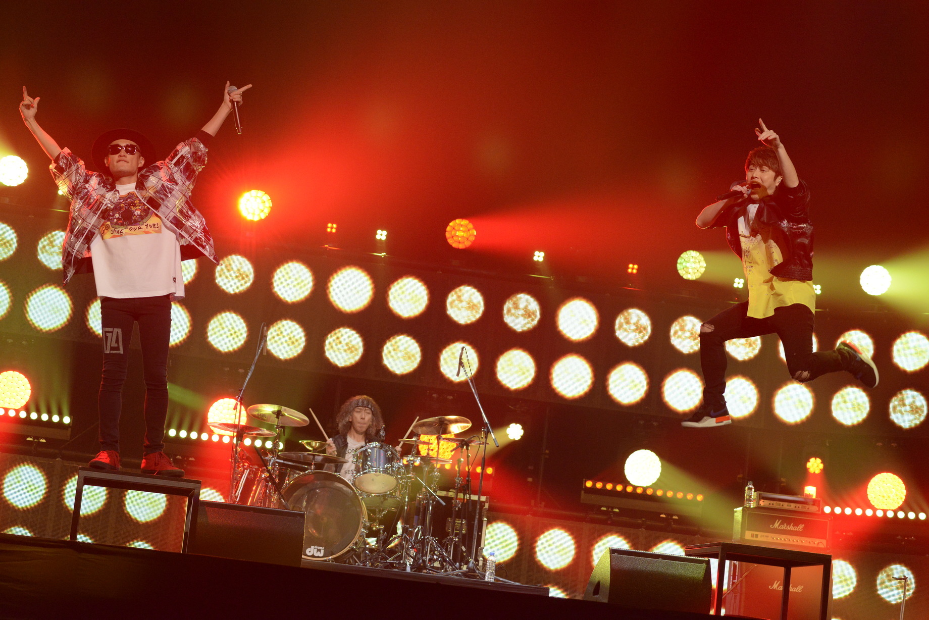 4組目には、TVアニメ『魔王学院の不適合者』つながりで、コヤマヒデカズ(Gt&Vo)、純市(Ba)、有田清幸(Dr)からなる3ピースバンドCIVILIANが登場。1曲目にはアップテンポなオープニングテーマ『正解不正解』を歌った。サイリウムは前のステージに引き続き、赤一色。見ているこちらも曲に合わせて自然と体が揺れてしまう。