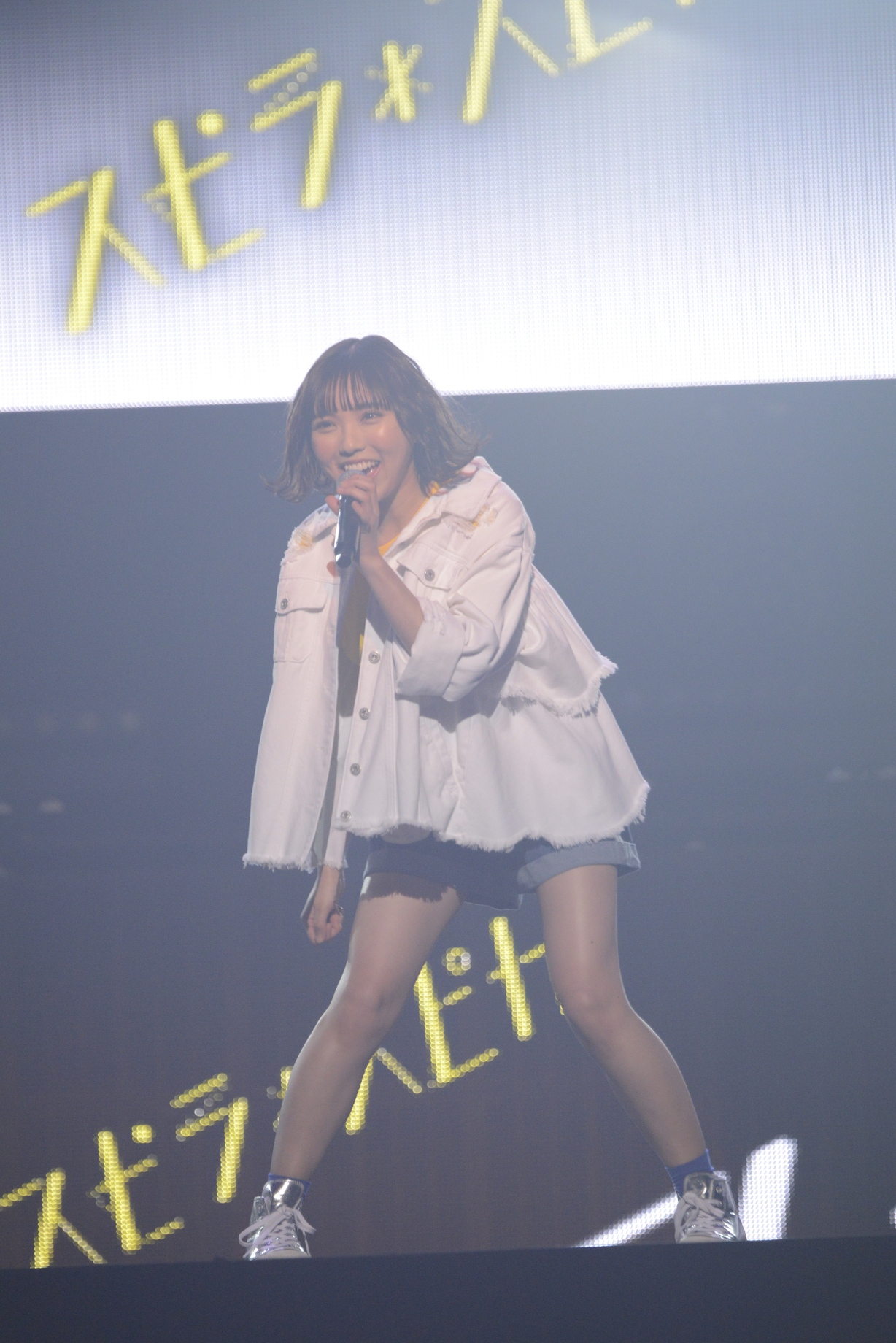 続く「しゅしゅしゅ」では、ピアノの音色に合わせて体をゆらす大人なダンスも披露。演出では、「しゅ」の文字がステージから客席へと向けて発進していくように空を舞う。映像だけでなく、斉藤朱夏の笑顔とキレのよいダンスで、楽しさあふれる舞台であった。