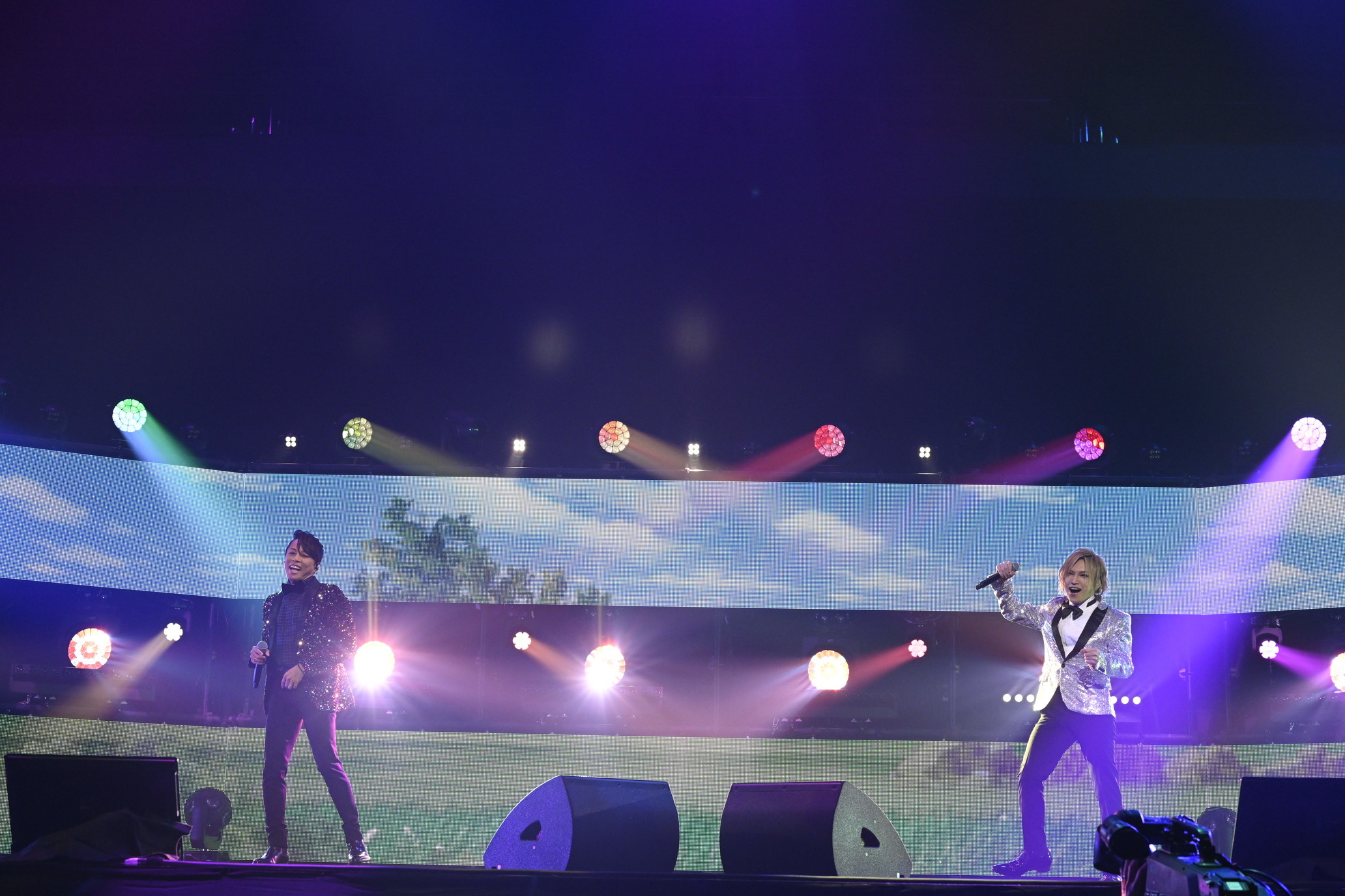 そして、「もっともっと一つになっていきましょう」と、3曲目にTVアニメ『NARUTO-ナルト-』よりオープニングテーマ「GO!!!」を飛び跳ねながら披露。楽曲終盤では、KEIGOの「ビッグウェーブカモン!」に合わせて、サイリウムのウェーブが1階席から最上階まで「ぐわん」と波打つように広がっていく演出が驚きだった。もはや、無観客とは感じさせないその映像は、見逃し配信などで是非実際にみていただきたい。