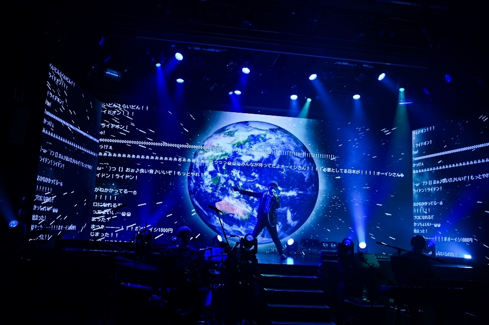 ステージのLEDディスプレイにはすぐさま膨大なコメントが異常なまでのスピードで流れていく。開始から10分も経たないうちに、きらびやかなダンサーを引き連れた2曲目が始まった頃には「#オーイシ1000円」はTwitterの日本トレンド1位に。配信でありながらギター・ベース・ドラム・キーボード・トランペット・サックス・トロンボーンというフルバンド編成で行われる歌唱・演奏に「これで1000円なの!?」「安すぎる!」といったコメントが相次いだ。