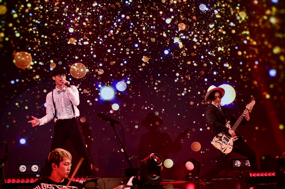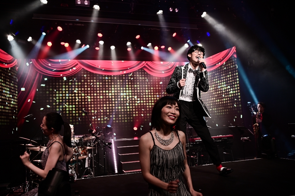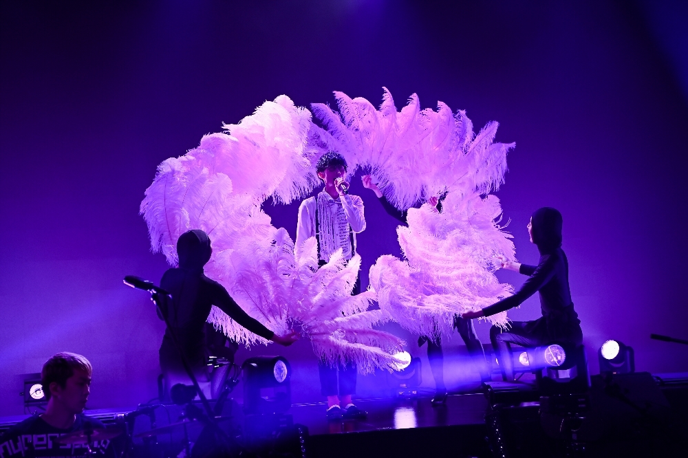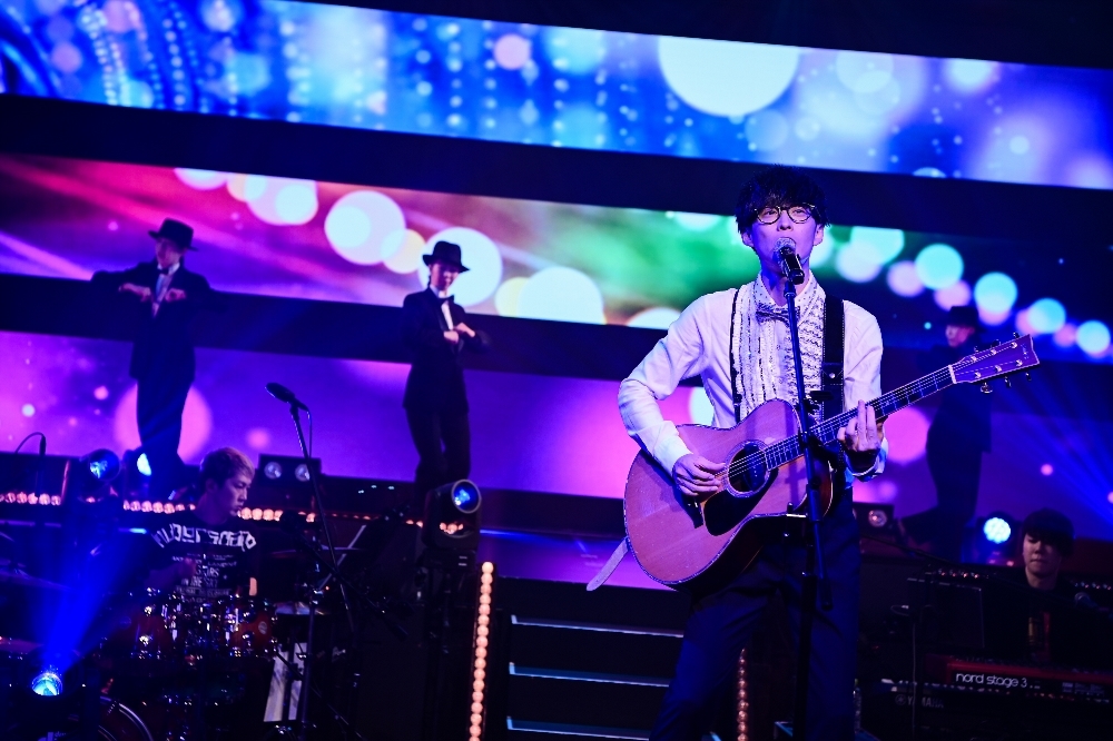 間髪入れずに披露された「学園天国」では再びダンサー4人と共演。続いてオーイシのダンスが印象的な「オトモダチフィルム」、アダルトな雰囲気漂う「楽園都市」などを披露。それぞれの曲に合わせてVJやダンサーの衣装が変わり、楽曲を一層盛り上げる。「枕男子」では、歌詞に合わせて照明を落とす演出も。その後ライトアップされたステージには、なぜかオーイシマサヨシに似たスタッフが登場するという遊び心で視聴者を楽しませた。