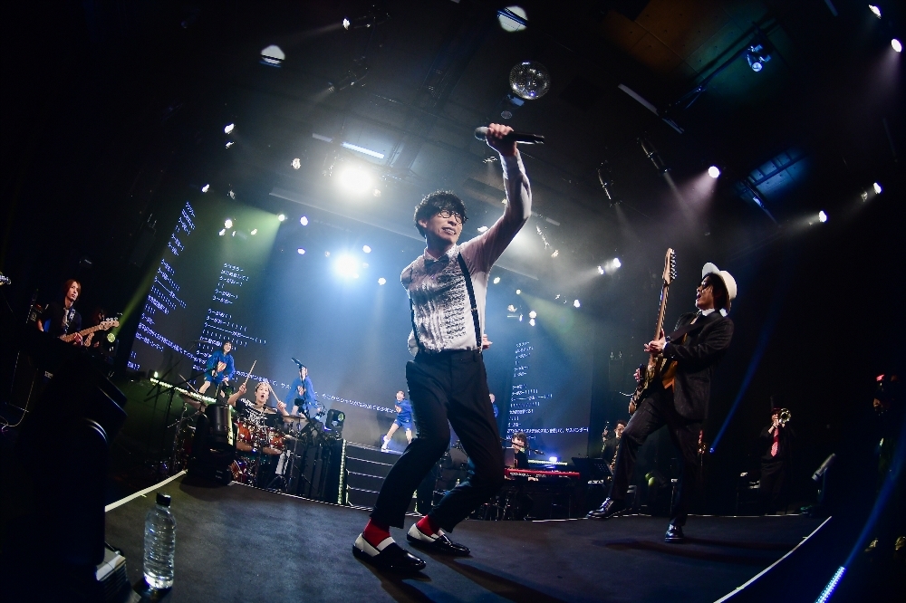 本番当日、オーイシマサヨシのみんなを楽しませたいという思いは、ステージに上がる前から始まっていた。キンカンの広告宣伝課長としてのショートドラマ風映像を挟んで、ステージに登場したオーイシは驚きの早着替えを披露。スパンコールがまぶしいジャケット姿で「世界が君を必要とする時が来たんだ」をパフォーマンスする。ライブタイトルでもあるヒーローを歌った1曲でライブがスタートした。