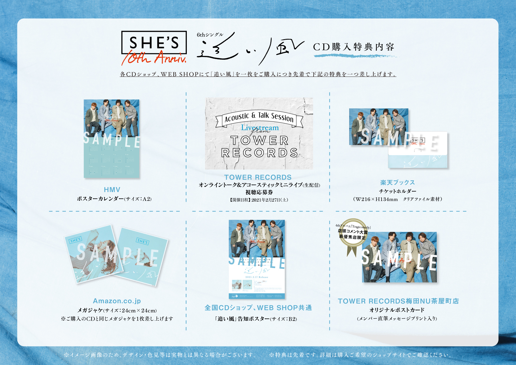 TOWER RECORDSでは、2月27日(土)に実施するオンライントーク&アコースティックミニライブ(生配信)視聴応募券、楽天ブックスではチケットホルダー、HMVはポスターカレンダー(サイズ:A2)、Amazonはメガジャケ、その他全国CDショップ、WEB SHOP共通で「追い風」の告知ポスター(サイズB2)がそれぞれの特典となる。