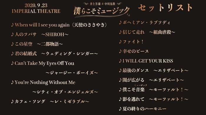 井上芳雄と中川晃教が帝国劇場で開催した一夜限りのコンサート『僕らこそミュージック』が、2021年1月24日(日)20時から日テレプラスでTV初独占放送される。配信とは異なる新編集版で、2人のインタビュー映像と共に届けられる。