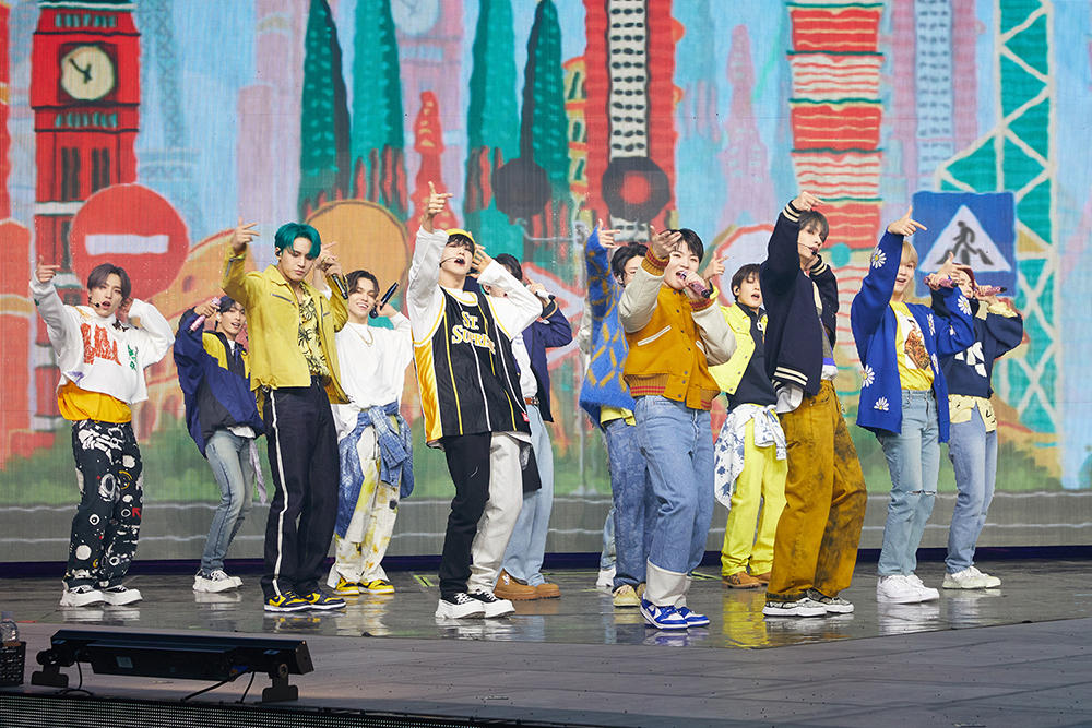 オープニングトークではウォヌが「皆さんの幸せを応援します。皆さんのストレスが今日、すべて解消されたらいいです」と話すと、メンバーからのむちゃぶりで即興の応援歌を披露。ジュンは「どこかで焦げる匂いがしませんか? 僕の心臓が燃えています。みんなへの愛が燃えているから」と人気ドラマのセリフを使って爆笑を誘った。