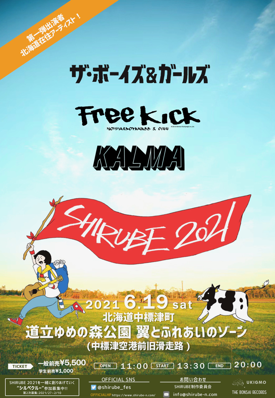 THE BOYS&GIRLSが、6月19日(土)に北海道・中標津町にて開催する野外フェス『SHIRUBE 2021』の第一弾出演者が発表された。第一弾出演者は北海道在住のアーティスト、FREE KICK(苫小牧)、KALMA(札幌)そしてTHE BOYS&GIRLS(札幌)の3組。