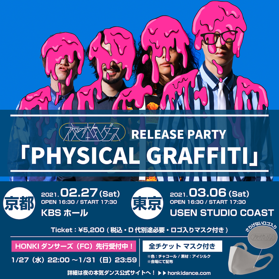 さらに『夜の本気ダンス RELEASE PARTY「PHYSICAL GRAFFITI」』のチケット最速先行もFC“HONKIダンサーズ”を対象に実施中。なお、ワンマン2公演のチケットは夜ダンの“ロゴ入り”マスクが付属する。