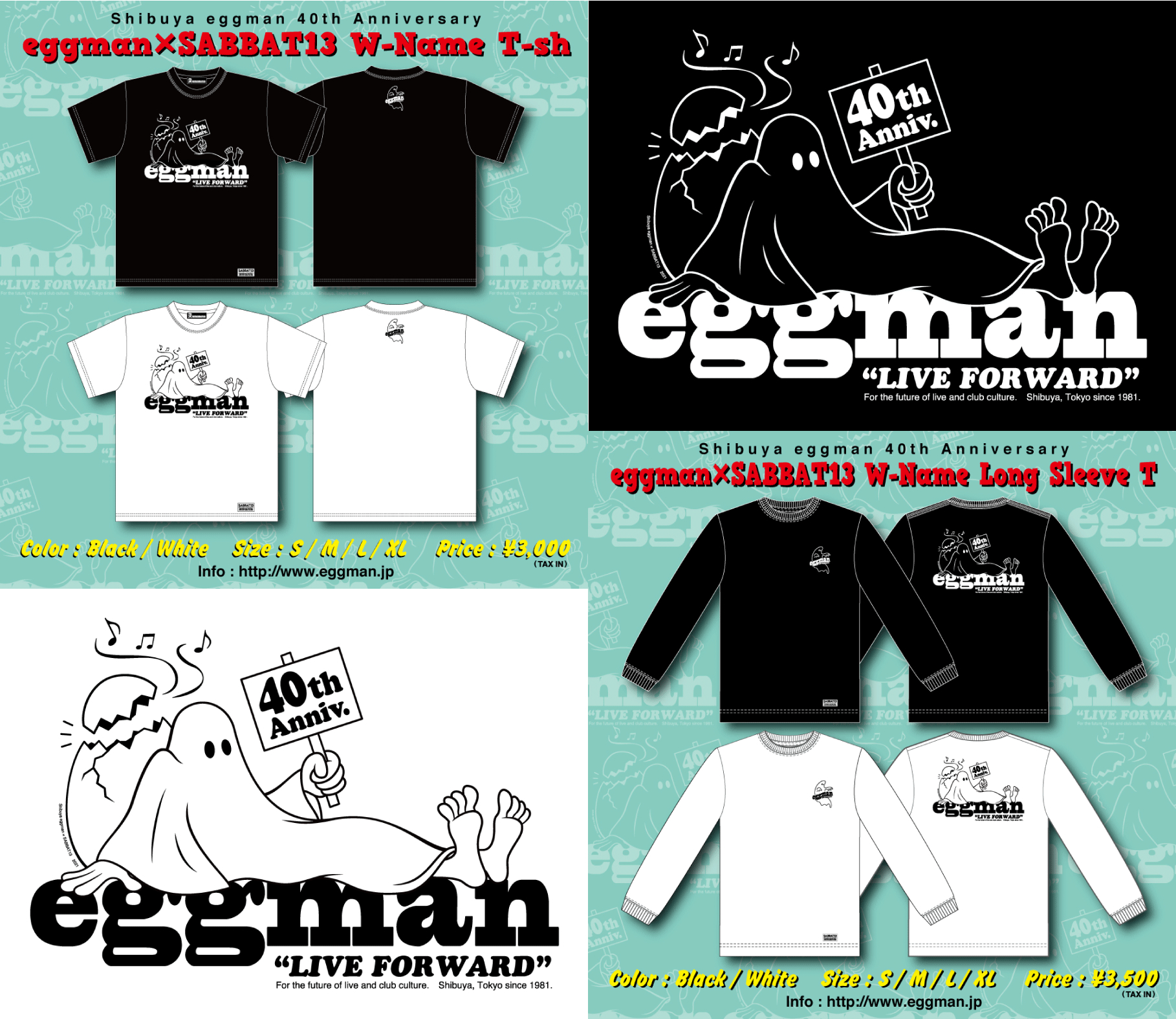 また、40周年を記念してアパレルブランド「SABBAT13」とのコラボアイテムとなる、『SABBAT13 x shibuya eggman40周年ダブルネーム Tシャツ』と『SABBAT13 x shibuya eggman40周年ダブルネーム ロングスリーブTシャツ』の発売も決定した。本日・2月1日から3月1日(月)23:59まで特設ECサイトにて予約販売を受け付けている。