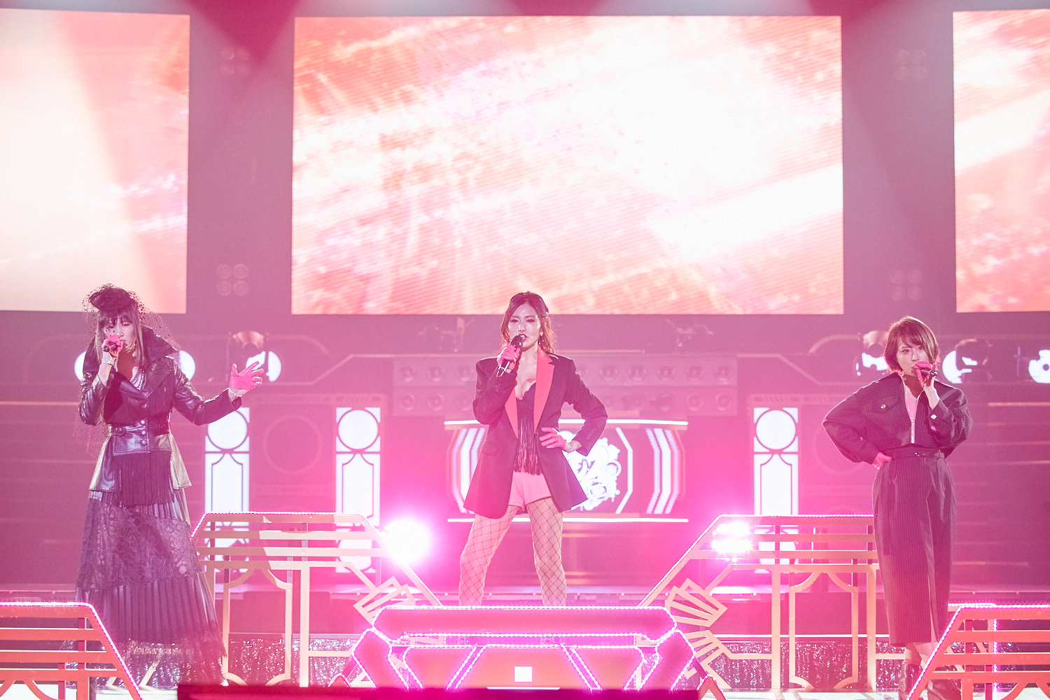 各ディビジョンのパートでは、登場VTRを挟んでメンバー3人が登場。オオサカ、イケブクロとそれぞれのソロ曲やチーム曲を織り交ぜながら息の合ったパフォーマンスを見せつけていく。また、ライブの中盤に突如、ファンにはすっかりお馴染みの“中王区のテーマ曲”と共に、東方天乙統女役の小林ゆう、勘解由小路無花果役のたかはし智秋、碧棺合歓役の山本希望の3人がセンターステージにサプライズ登場。昨年発表となった楽曲「Femme Fatale」をパフォーマンス初披露。堂々と歌い上げた。