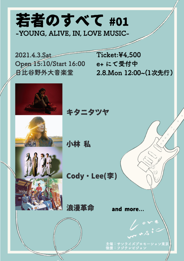 「若者のすべて #01 -YOUNG, ALIVE, IN LOVE MUSIC-」は、フジテレビの音楽番組「Love music」(毎週日曜 24:30~25:25 放送)と初タッグを組み行うスペシャルライブとなっている。第一回となる今回は、若手ミュージシャンの中でも今特に邦楽シーンで注目を集めているキタニタツヤ、小林私、浪漫革命、Cody・Lee(李)が日比谷野外大音楽堂に集結する。