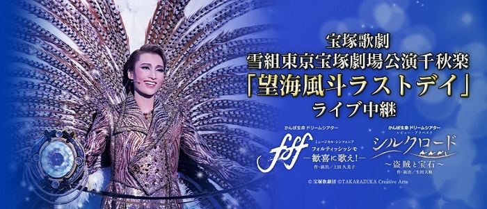 2021年4月11日(日)、宝塚歌劇団 雪組トップスター・望海風斗の退団公演となる、かんぽ生命 ドリームシアター ミュージカル・シンフォニア『f f f -フォルティッシッシモ-』~歓喜に歌え!~、かんぽ生命 ドリームシアター レビュー・アラベスク『シルクロード~盗賊と宝石~』東京宝塚劇場千秋楽の模様を、全国各地の映画館でライブ・ビューイングが決定した。