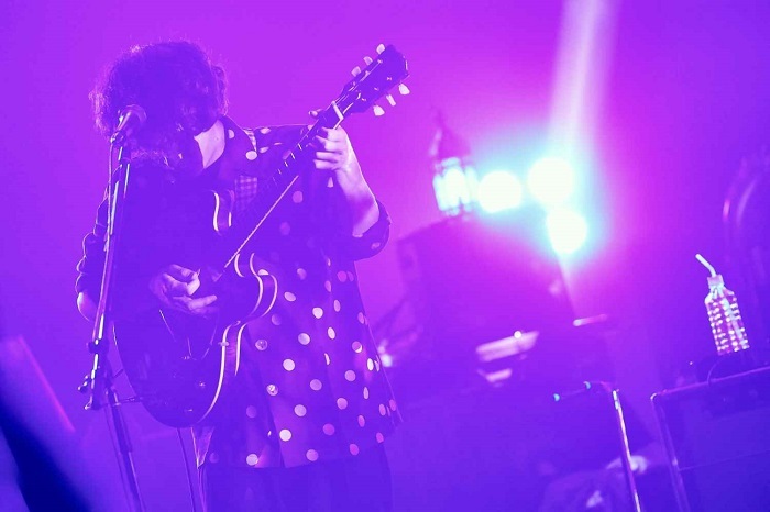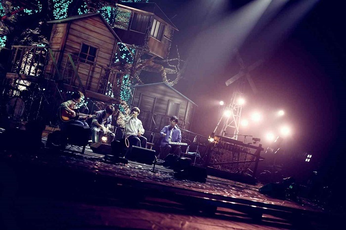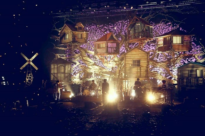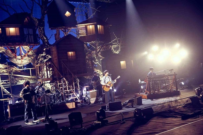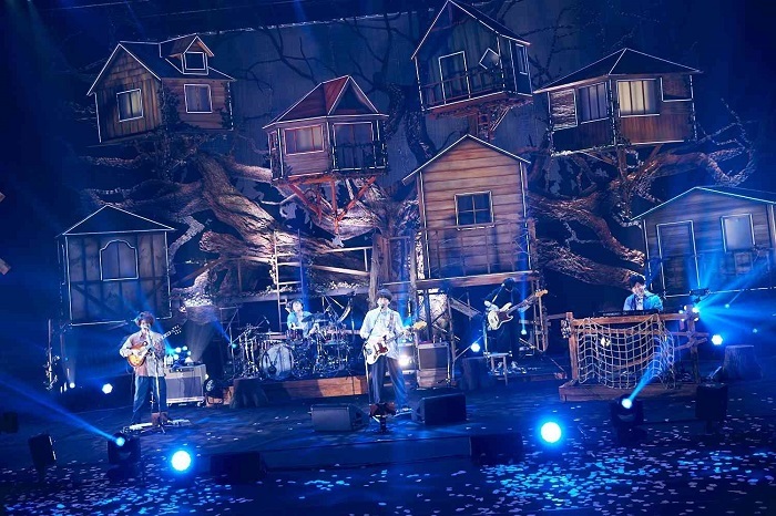 一瞬の暗転後、紗幕越しに大きく手を掲げるメンバーのシルエットが映し出され、<ラララ>というハーモニーとともに幕が下り、のちのMCでヴォーカル&ギターの片岡健太が「ツリーハウスじゃなく、木に家をぶっ刺してくださいとお願いした」という7件の家が連なる大木を背にしたバンドが登場し、真っ直ぐに前を向いて進んでいくんだという意思が込められた「センス・オブ・ワンダー」でライブは勢いよくスタートした。