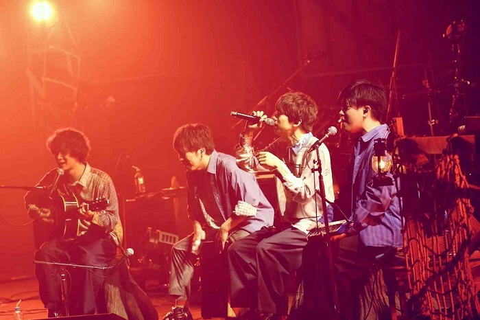 アコギの弾き語りから始まった「リグレット」では穏やか休日にさす木漏れ日ようなトーンでファンの心を温め、チャットとTwitterを連動させたリクエスト企画では、ドロドロのラブソング「Travelling」に大差をつけて、ピュアピュアラブソングの代表「いいのに」が勝利。「この曲、久しぶりだな」と語った片岡はハンディカムを手に、メンバーを撮影しながら歌唱。劇場アニメ「君の膵臓が食べたい」の主題歌「春夏秋冬」で涙を誘ったあと、ライブでは常に大合唱が巻き起こる「伝言歌」を熱唱。