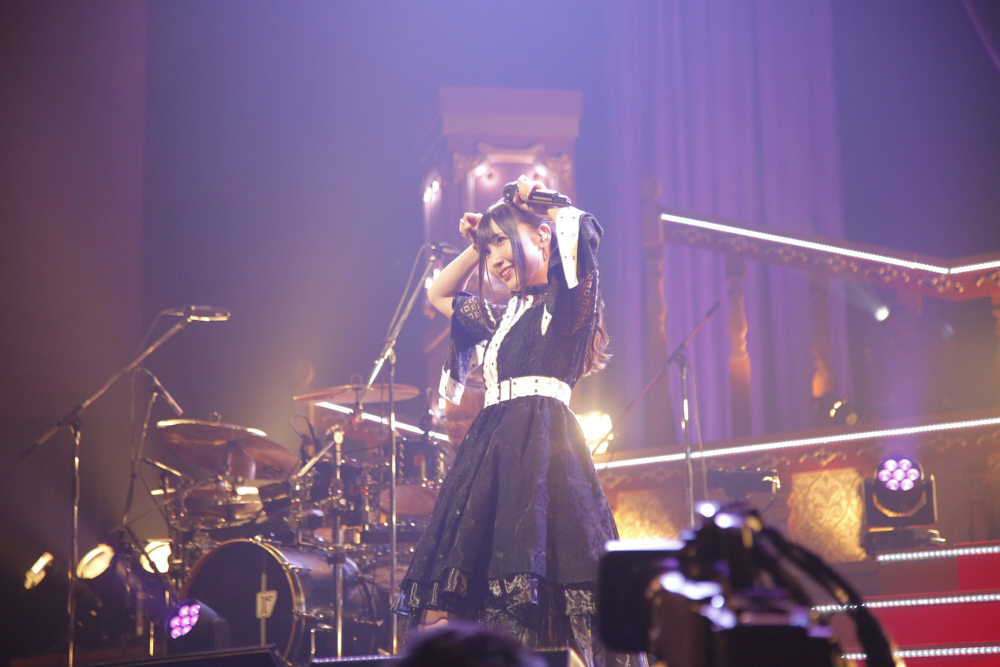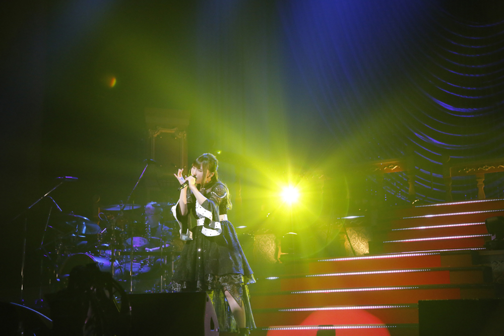 舞台は再び暗転し、ドラムへスポットライトが当たるとバンドの各パートへとリレーしていくインターリュードがスタート。どこからともなく三味線や琴の音が聞こえてきたと思いきや、花魁風の艶やかな真紅のドレスにお色直しした彼女が登場し「玉響」、ソーラン節のコールアンドレスポンスが楽しい「祭リズム」、「月夜見moonlight」と和テイストなロックナンバーを3曲続けて届けた。