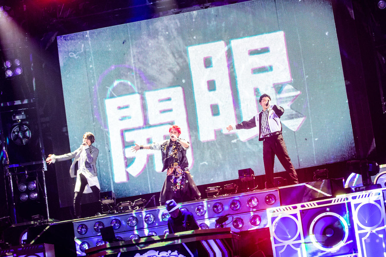 また、ライブの中盤では中王区 言の葉党、東方天乙統女役の小林ゆう、勘解由小路無花果役のたかはし智秋、碧棺合歓役の山本希望の3人がセンターステージに登場。昨年発表となった中王区の楽曲「Femme Fatale」を堂々歌唱。次にGADOROとDJ KRUSHが手掛けたシンジュク・ディビジョン“麻天狼”による新曲「TOMOSHIBI」や“MOROHA”のMCアフロと“あらかじめ決められた恋人たちへ”の池永正二が手掛けたナゴヤ・ディビジョン“Bad Ass Temple”による新曲「開眼」の初披露も行われた。