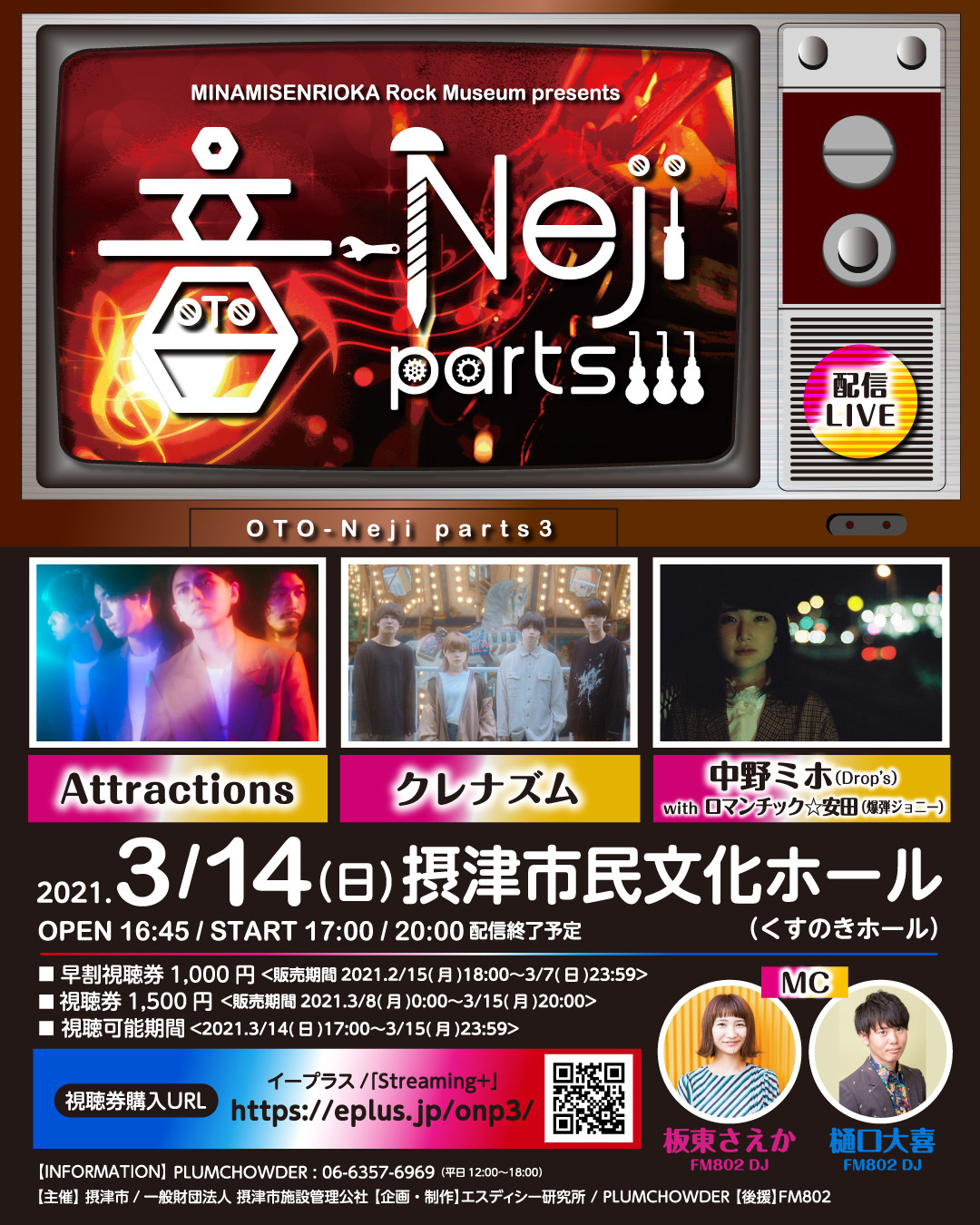 本イベントは、2013年、「音でまちを元気に」をテーマに、摂津市南千里丘を舞台に生まれた音楽イベント『南千里丘Rock Museum』(=『丘ロック』)の応援イベントとして、2018年から開催されている『音-Neji』 の第3回目。なお、今回はイベント初の無観客配信LIVEで開催となる。