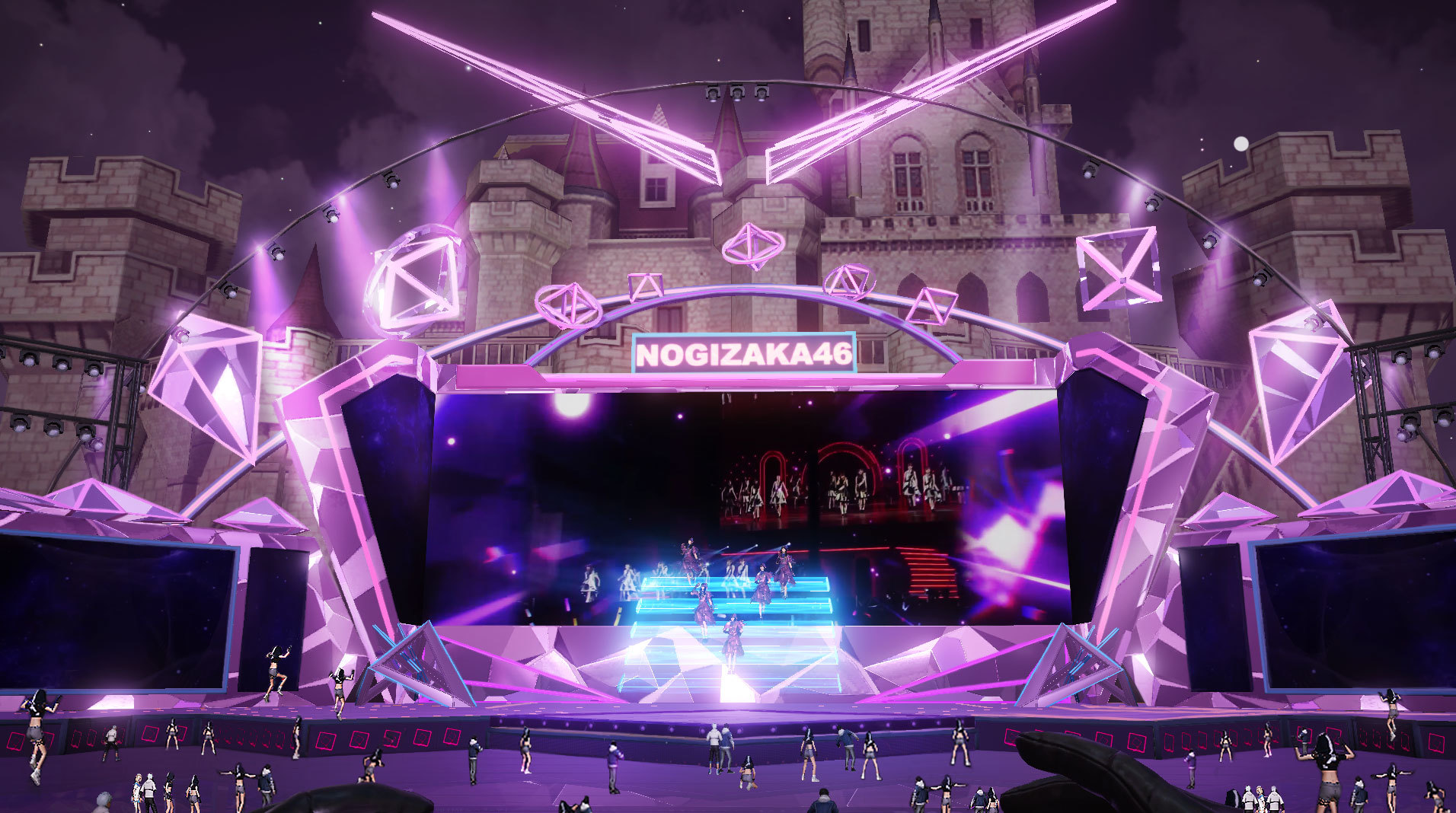 衣装チェンジしたアバターの彼女たちが、ボトムヘヴィなドラムとベースと、その上に乗るド派手なシンセや加工しまくった声ネタが耳に残る、このトランスナンバーを歌い踊るあいだ、特設フィールドは花火大会会場と化す。普通の地面に戻ったフロアの上空にはいくつもの花火が打ち上げられ、それに呼応したオーディエンスもロケット花火弾を打ち上げて、ステージ上の彼女たちを盛り上げる。また落ちサビ直前、アバターたちはステージ上に現れたクルマに乗り込み、下手からステージ袖へと消えたかと思えば、瞬く間に上手からステージへと現れる、これまたバーチャルならではの演出でオーディエンスの度肝を抜いてみせた。