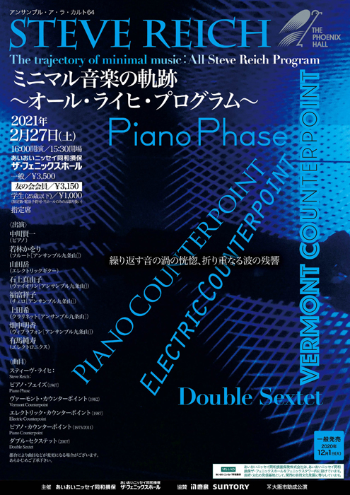 短い音形を執拗に繰り返し、複数を組み合わせ、徐々に変形と変貌を遂げながら音楽の花を開かせる「ミニマル音楽」。その音楽の先駆者であり巨匠のスティーヴ・ライヒの作品を取り揃え、その軌跡を俯瞰する「オール・ライヒ・プログラム」が、2021年2月27日に大阪のあいおいニッセイ同和損保ザ・フェニックスホールで開催される。その鮮烈なプログラムからか、すでにチケットは完売。演奏は、現代音楽に造詣の深いピアニストの中川賢一やアンサンブル九条山、ギタリストの山田岳、そしてエレクトロニクスには有馬純寿も「共演」する。