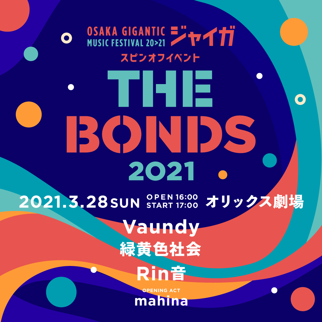 そして、第一弾として2021年3⽉28⽇(⽇)オリックス劇場にて『THE BONDS 2021』が開催される。出演はVaundy、緑⻩⾊社会、Rin⾳ 、オープニングアクトとしてmahina。