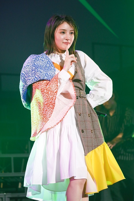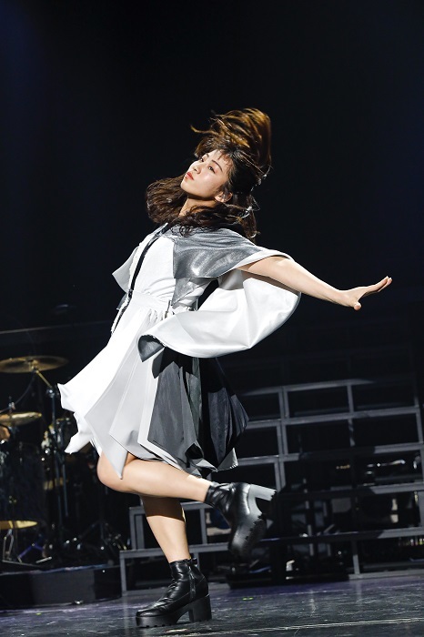 するとバンドメンバーBa. MIYA / Gt. 芳賀義彦 / Dr. Tatsuya(Crossfaith)の迫力あるセッションがはじまった。そのバンドサウンドの中、坂本遥奈が登場し、演奏に合わせて躍動感とキレのあるダンスで魅了する。「It’s New 世界」では、今回のライブタイトルにもある「Navigates Spotlight」にちなんだ、印象的なレーザーの演出で、まさに”新しい世界”へ誘うように、明るい未来を照らした。