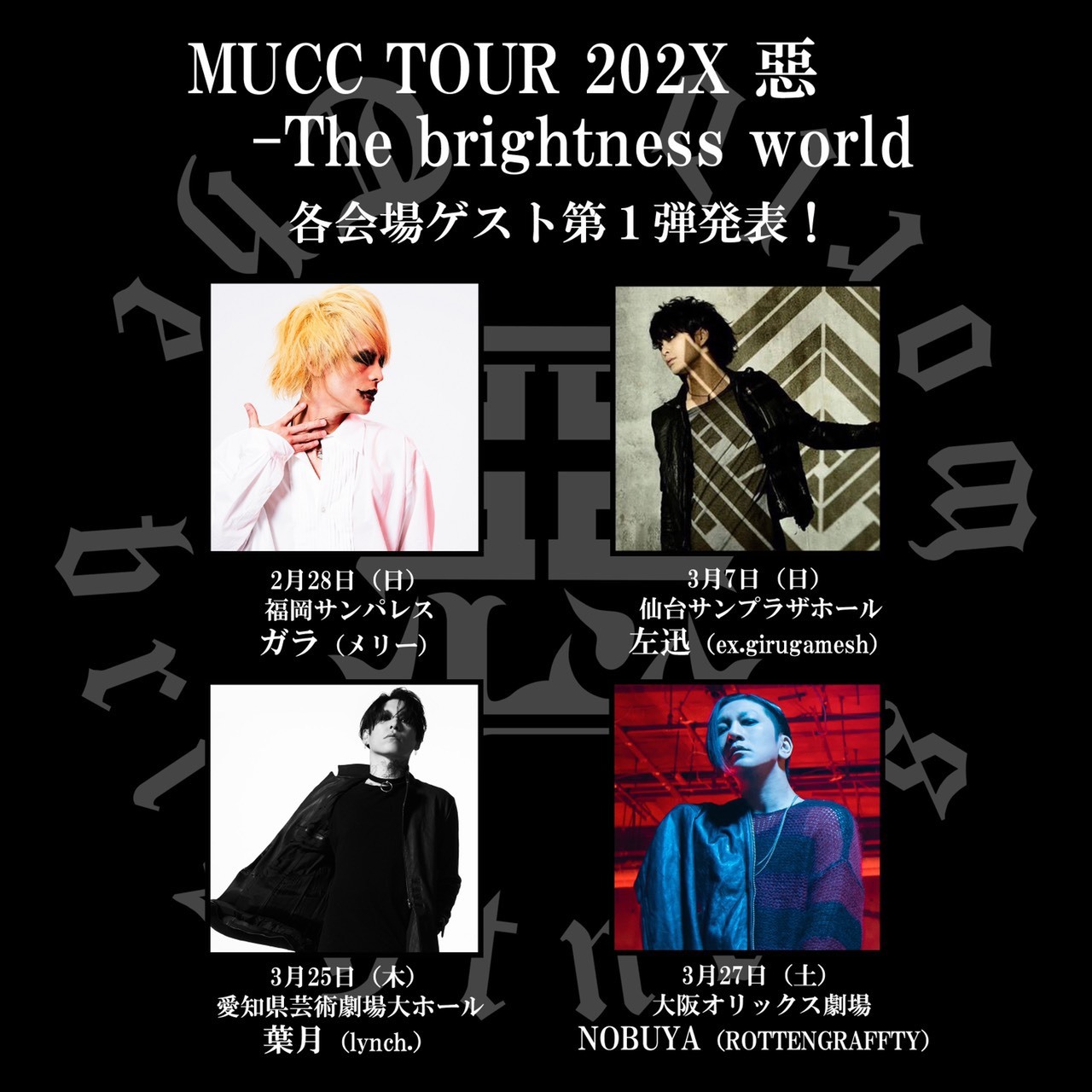 MUCCが2月28日(日)福岡サンパレスからスタートするホールツアー『MUCC TOUR 202X 惡-The brightness world』の、各会場ゲスト第一弾が発表された。