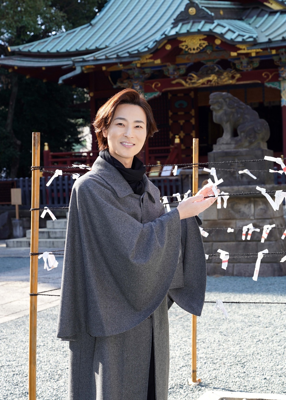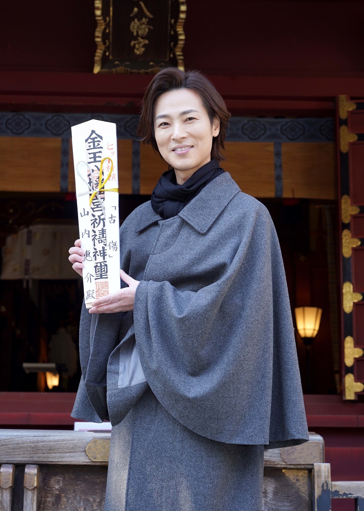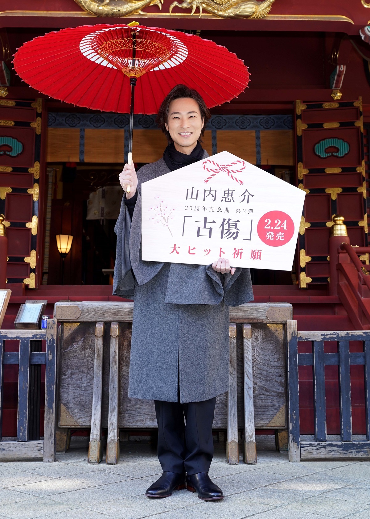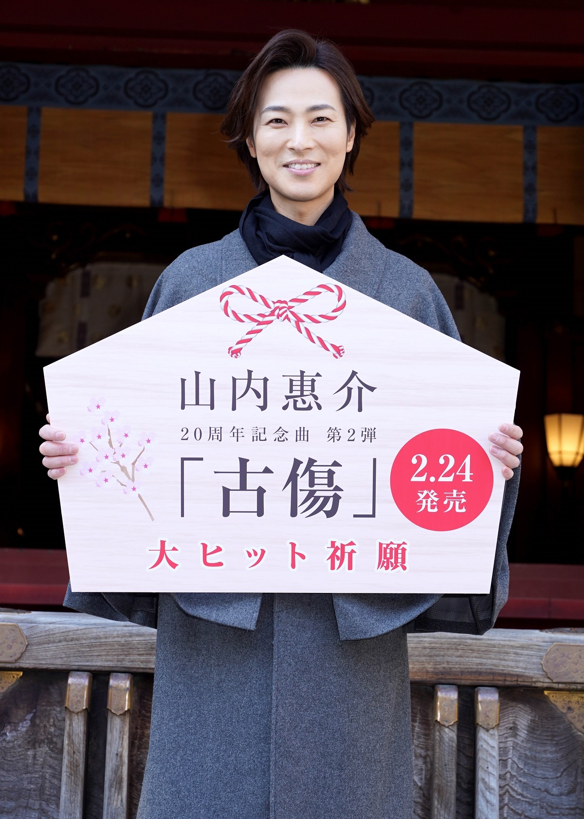 山内惠介が、デビュー20周年記念曲第2弾シングル「古傷」を2月24日に発売するのを記念して、22日、東京・渋谷区の金王八幡宮で新曲ヒット祈願を行った。