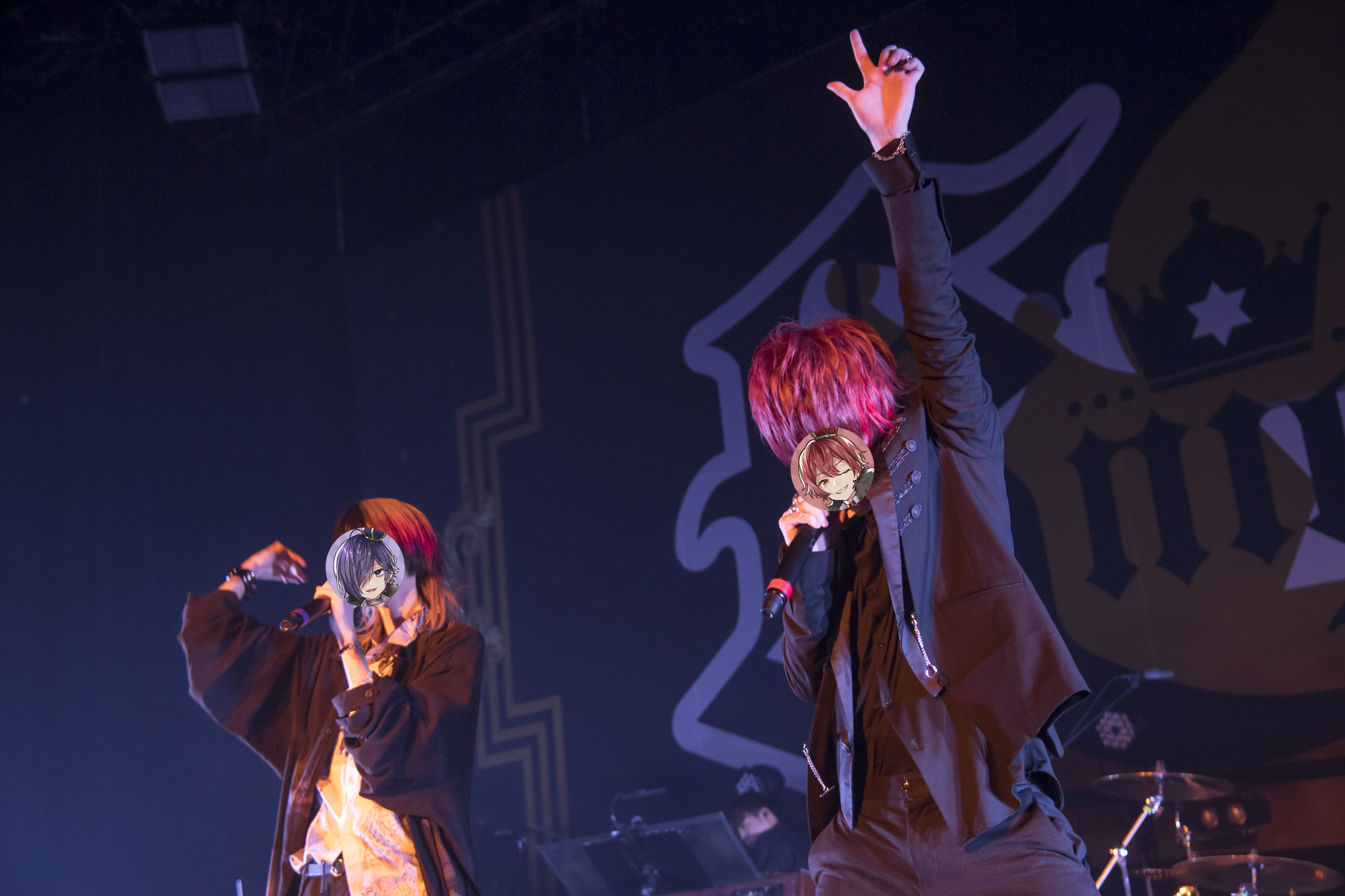 ゆきむら。=パープル、ばぁう=レッド、そうま=イエロー、しゆん=グリーン、てるとくん=ピンク、まひとくん。=ライトブルーというメンバーのイメージカラーを灯したライトが目まぐるしく交錯するステージに現れ、客席に背を向けて立った横並びの6人。オーディエンスの期待感が最高潮に高まる中、全員でくるりと振り向き、順繰り歌をつないでいったのは「フィクサー」だ。歌声もパフォーマンスも衣装も6人6様でありながら、一丸となったときの団結力、爆発力といったら目を見張るほど。続く「フラジール」にしても然り、その“無双感”は、前日にKnightA-騎士A-として初ステージを踏んだとは思えない。