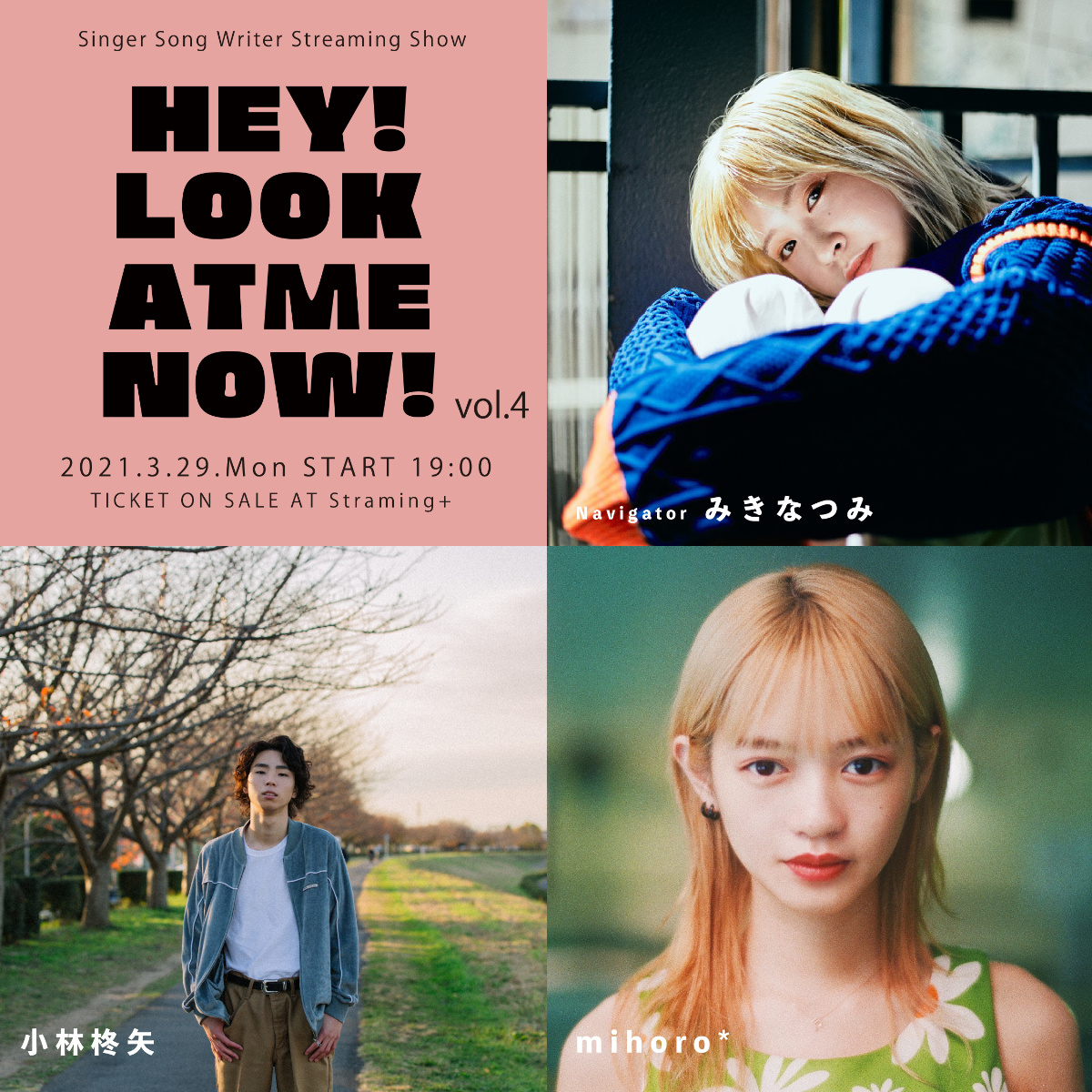 『HEY! LOOK AT ME NOW!』は番組ナビゲーターにみきなつみを迎え、番組タイトルの和訳「ねえ!今の私を見て!」の通り、共演者同士のセッションやトークなど普段のライブでは観ることができない、シンガーソングライターたちの"今の姿"を都内のライブハウスからお届けする音楽配信番組。イープラス『Streaming+』を通して生配信される。