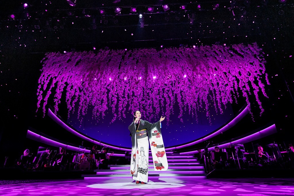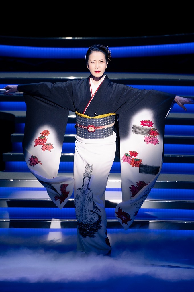 歌唱ステージでは、芝居にも出演した歌手の森山愛子が歌う場面も。中盤には坂本がヒット曲『また君に恋してる』をウェディングドレスのような純白の衣装で歌い上げ、観客を魅了した。桑田佳祐が作詞・作曲を手がけたことでも話題の最新曲『ブッダのように私は死んだ』では、仏陀が描かれた着物を身にまとった坂本が、燃えるステージの中で熱唱。全てを燃やし尽くすような熱い歌声に、時間が止まった。