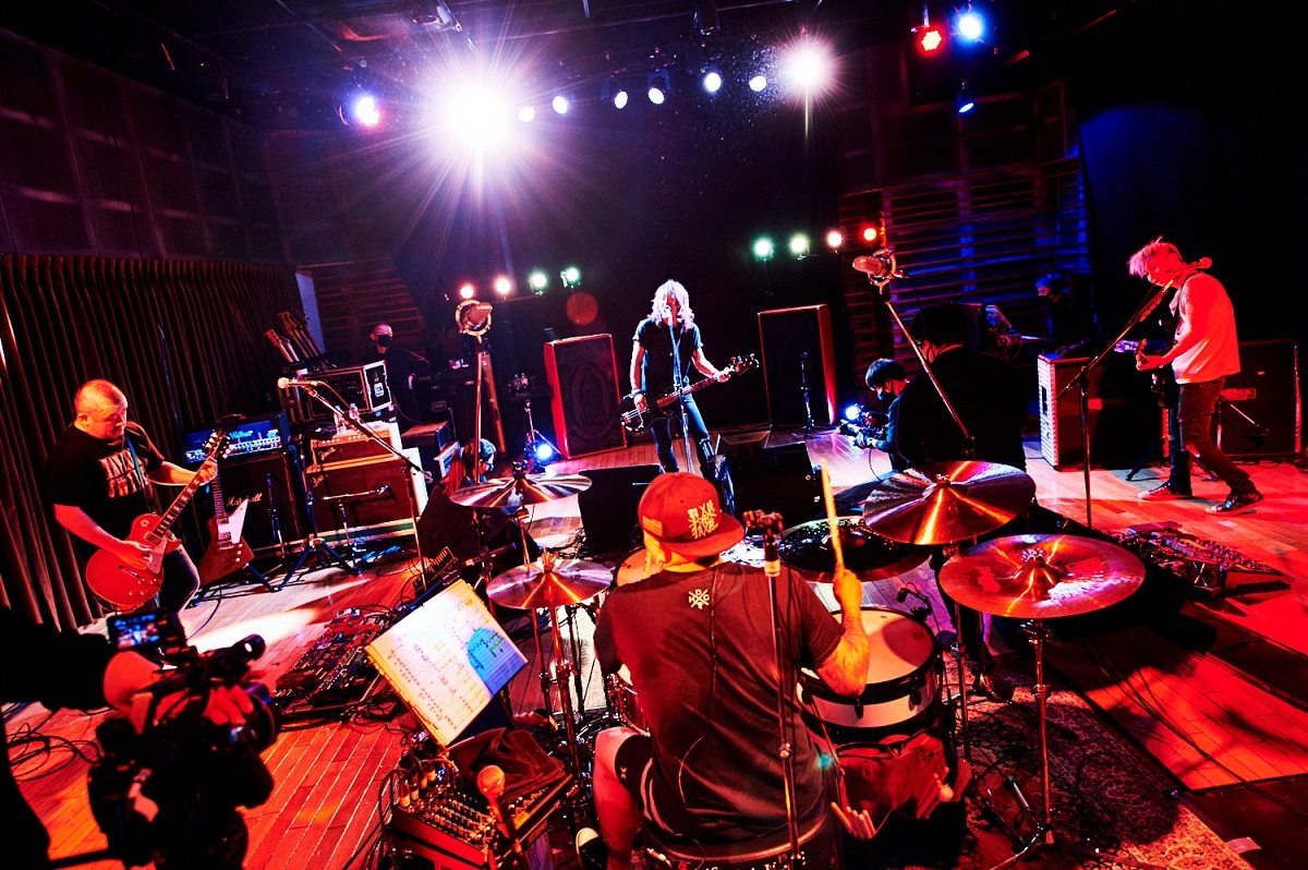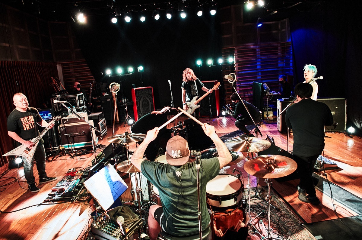 時刻が21時を過ぎると、SEが流れる中Jバンドのメンバーが次々と登場し、Jの「イケるかぁ!」の合図からスピード感あふれるリフが際立つロックナンバー「TWISTER」を放ち、今年1発目のストリーミングライブの幕が開けた。スタジオの中心に向かってメンバー全員が向き合い音をぶつけ合うスタイルで、その後も「Super High」「Vida Rosa」「OVER DRIVE」「Suicide Dream」など、久々に披露される楽曲を次々と投下。これまでにない新鮮な構成ながらも、その熱とグルーヴはいつにも増してスタジオ内と画面の向こう側を凌駕していった。