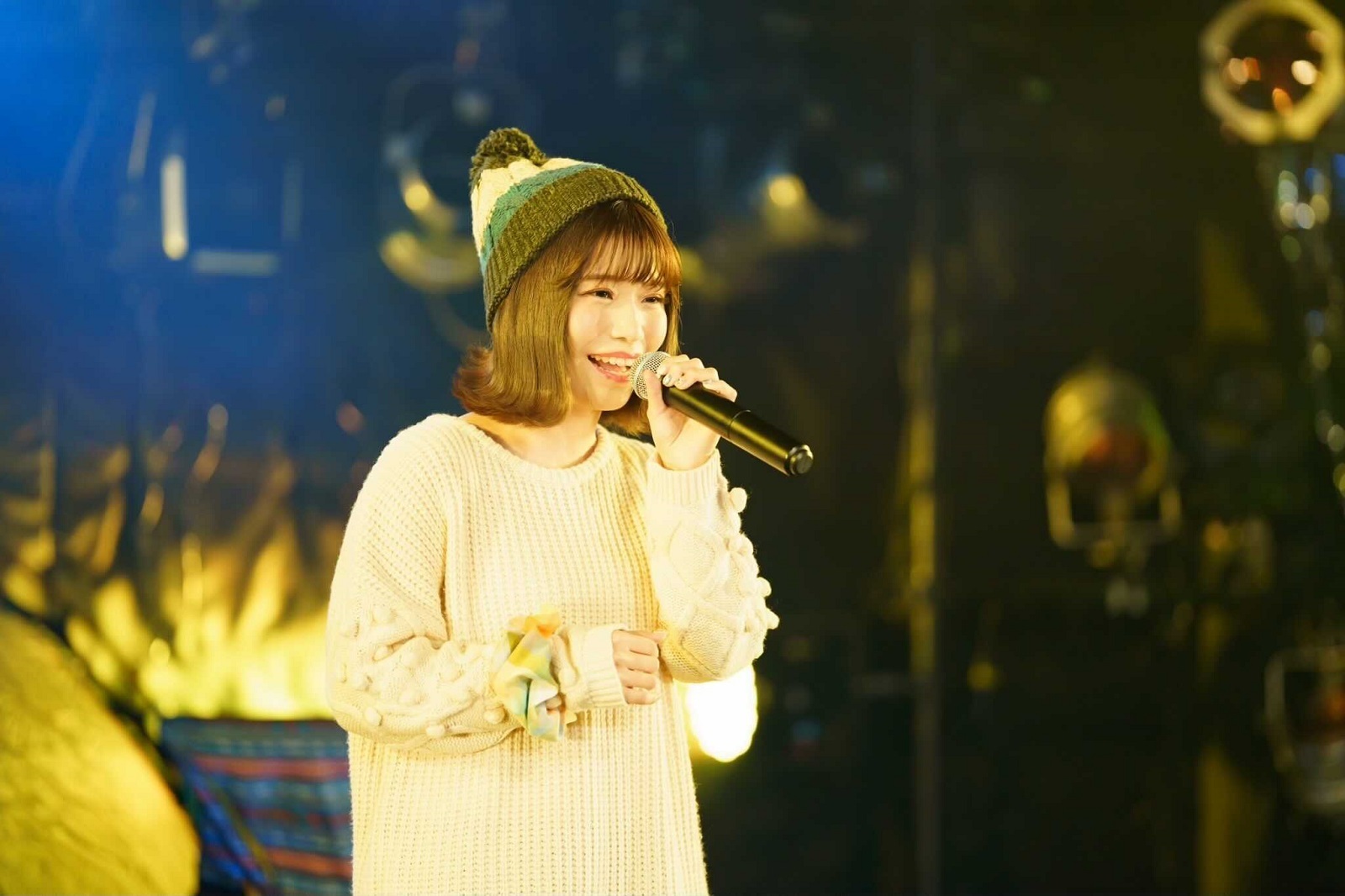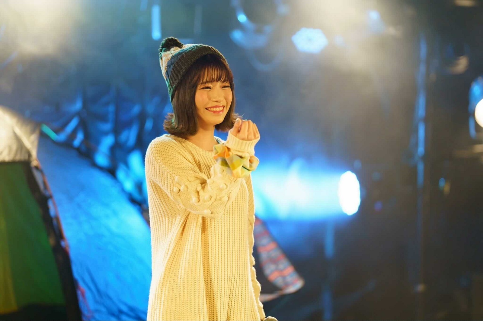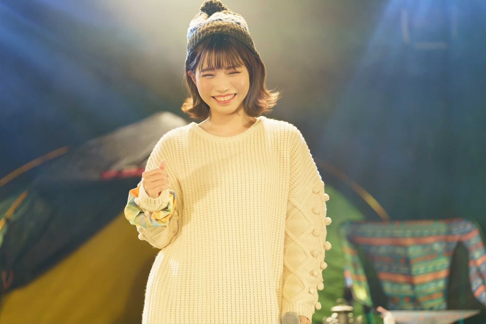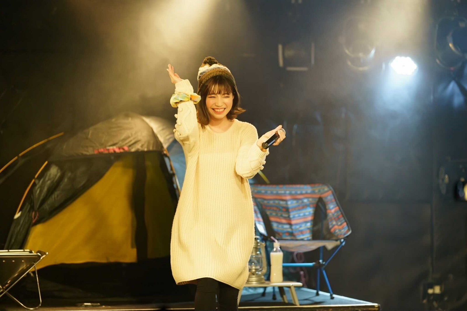『ゆるキャン△』楽曲をはじめとした“ゆるっと”聴きたい亜咲花の楽曲で構成されたオンラインライブ&トークは、テントやキャンプチェアが並ぶステージに「SHINY DAYS」や「Seize The Day」のMVでおなじみの白いニットワンピの衣装で登場。