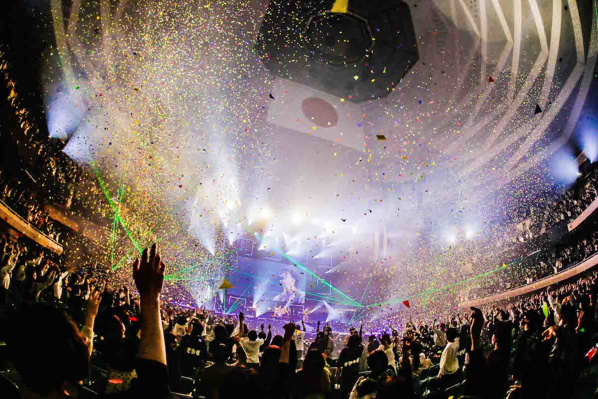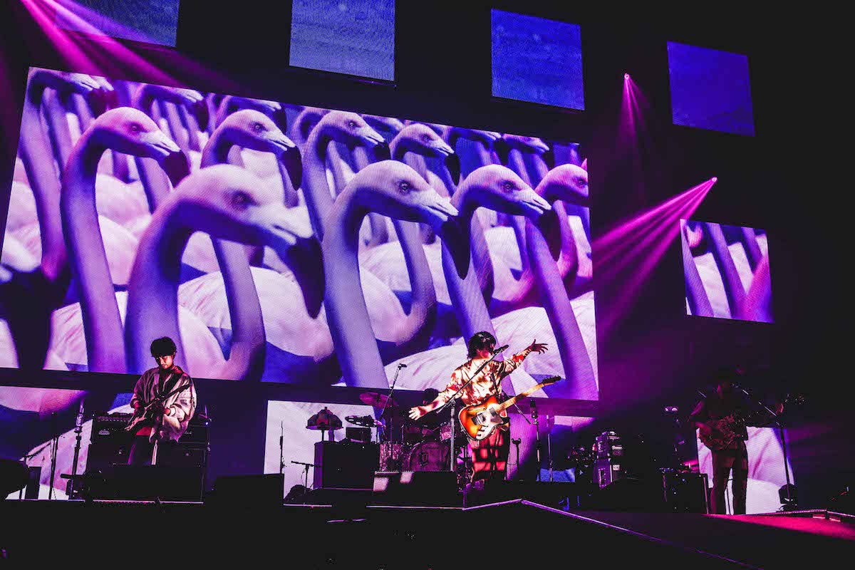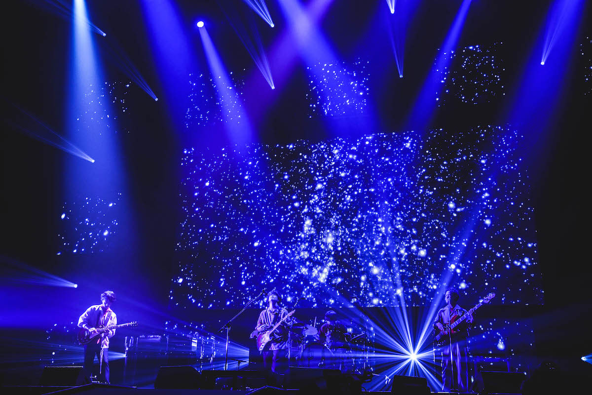 そして、「今日この時間を選んでくれてありがとう。あなたのオンリー・ワンに感謝します」と健司が言いながら繋げたキラー・チューン「オンリーワンダー」では、手拍子で熱演に応える観客の上にキャノンで放たれた無数の紙吹雪が舞い落ち、クライマックスに相応しい景色を作り上げる。そこから、前述したとおり、「俺らは俺らの遊び方で世の中をおもしろくしていきたいと思います」(健司)と「されどBGM」で本編を終えたバンドは、その後、さらにアンコールとして新曲2曲を含む3曲――シンガロング・パートが印象的な爽やかなギター・ロック・ナンバー「サーチライトランナー」、代表曲中の代表曲と言える「オドループ」、そして「名悪役」を演奏した。