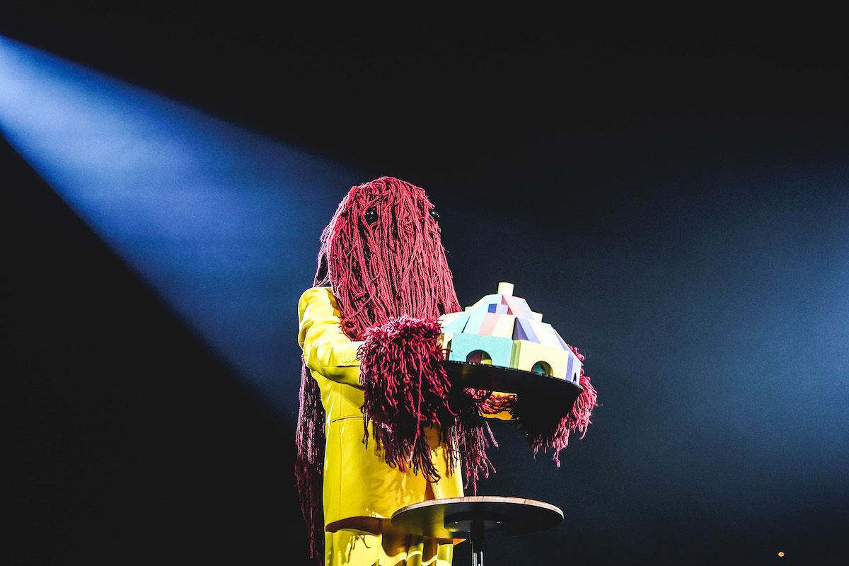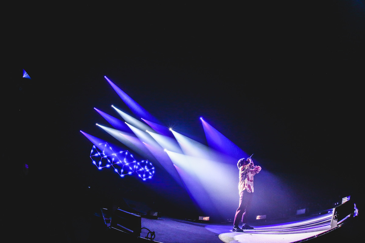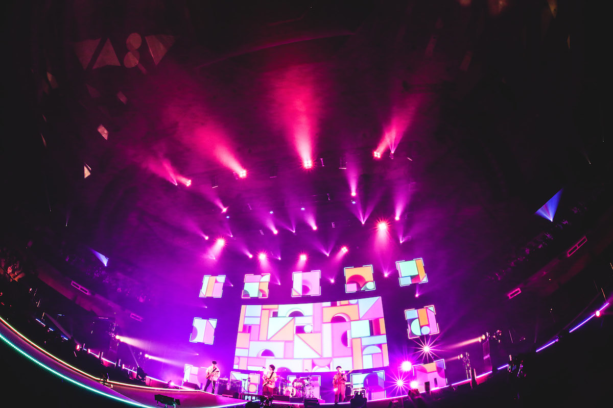 「Wake Me Up」のMVに登場以来、バンドのマスコットとして人気のwakemeがまずステージに現れ、深々と一礼。前述したショート・ムービーが観客の気持ちをぐーっとステージに集中させてから、「始めます!」という健司の言葉からなだれこんだのは、新たなダンス・ビートをアピールした「Wake Me Up」。そこから今現在の世の中のもやもやした空気に対するメッセージにも思えた「シンセンス」「逃避行」とアップテンポの曲を繋げながら、ハンドマイクの健司がアリーナの真ん中に作ったセンター・ステージに伸びた花道のみならず、ステージから左右に伸びた袖も使って、最後列はもちろん、端から端まで、会場全体に歌を届ける。すると、声こそ出せないものの、精一杯身振り手振りで観客が応え、あっという間に大きな盛り上がりが生まれていった。